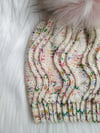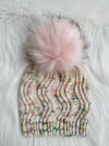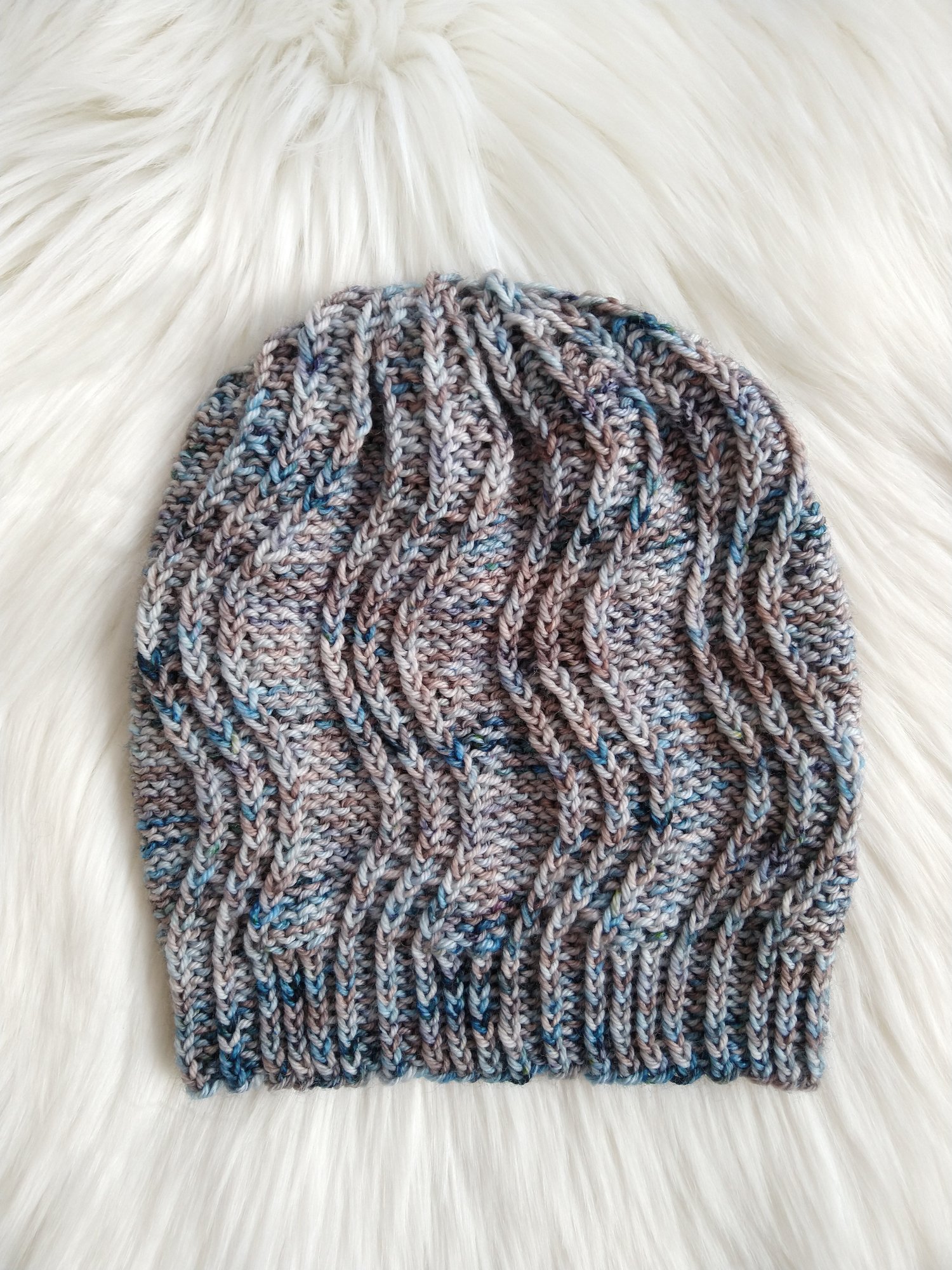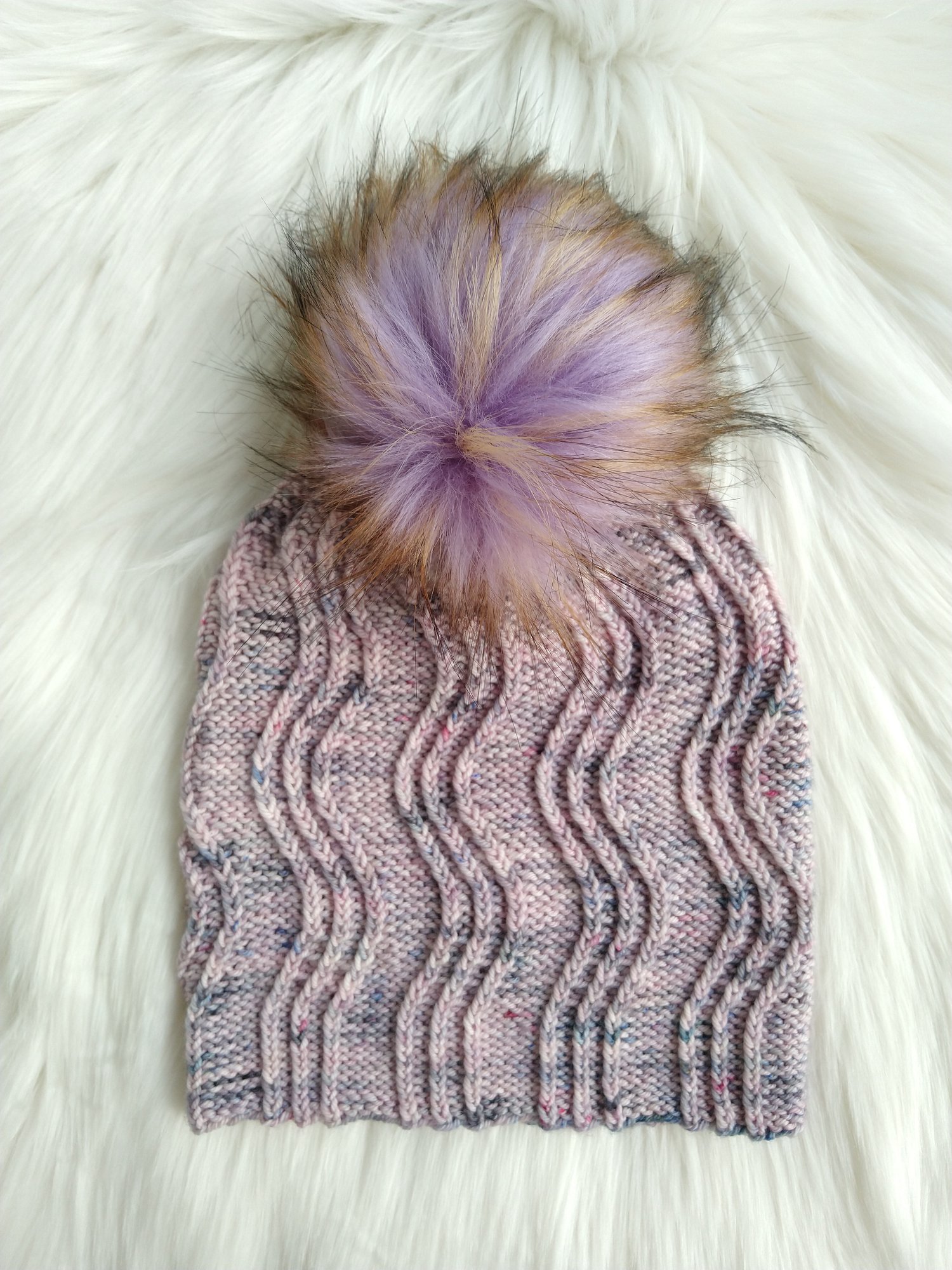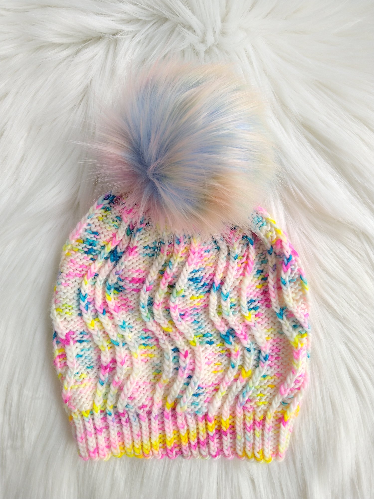 Named for the sweet magical treat Fizzing Whizzbees, this whimsical design wiggles its way into your heart. Fizzing Whizzbees are large sherbet balls that cause the person sucking on it to float a few inches off the ground, which I think the squiggly lines imitate. Using simple right and left twist stitches against reverse stockinette background, this one fizzes into a beautiful crown!