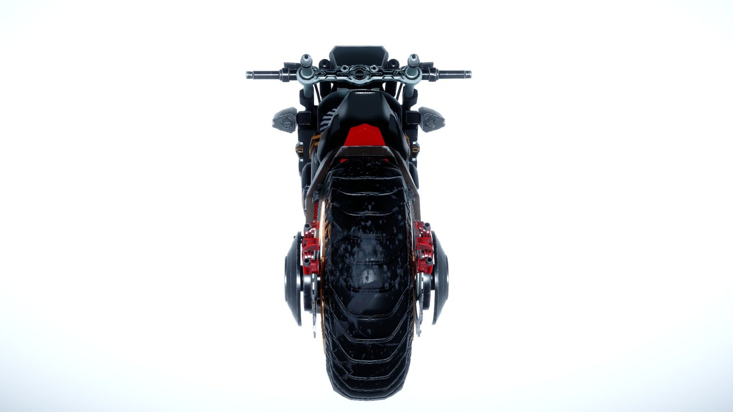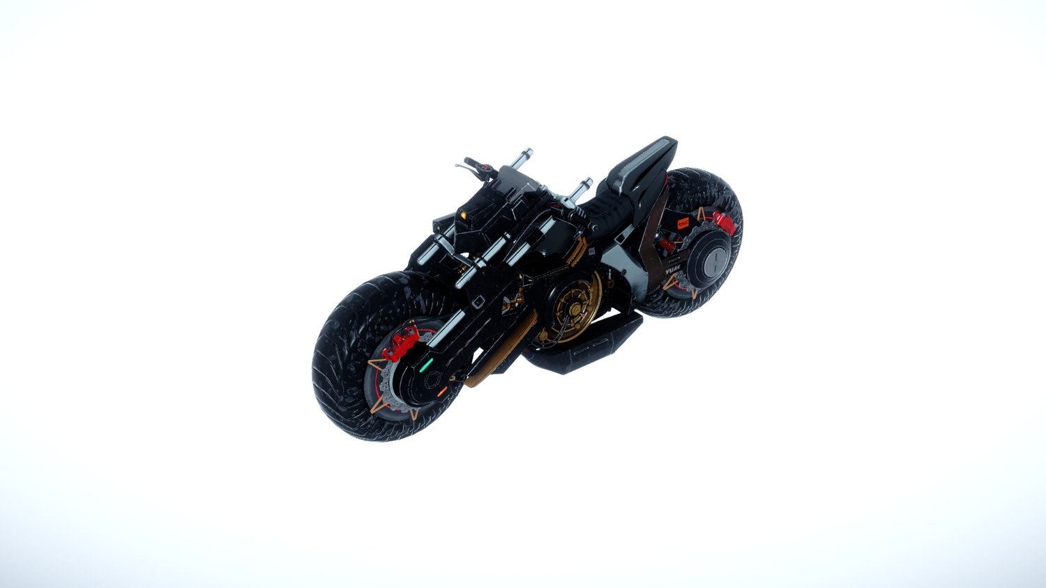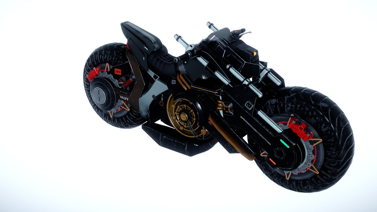 Technological Aesthetic: With a bold appearance and visible components, this motorcycle stands out in futuristic and science fiction-themed scenes.