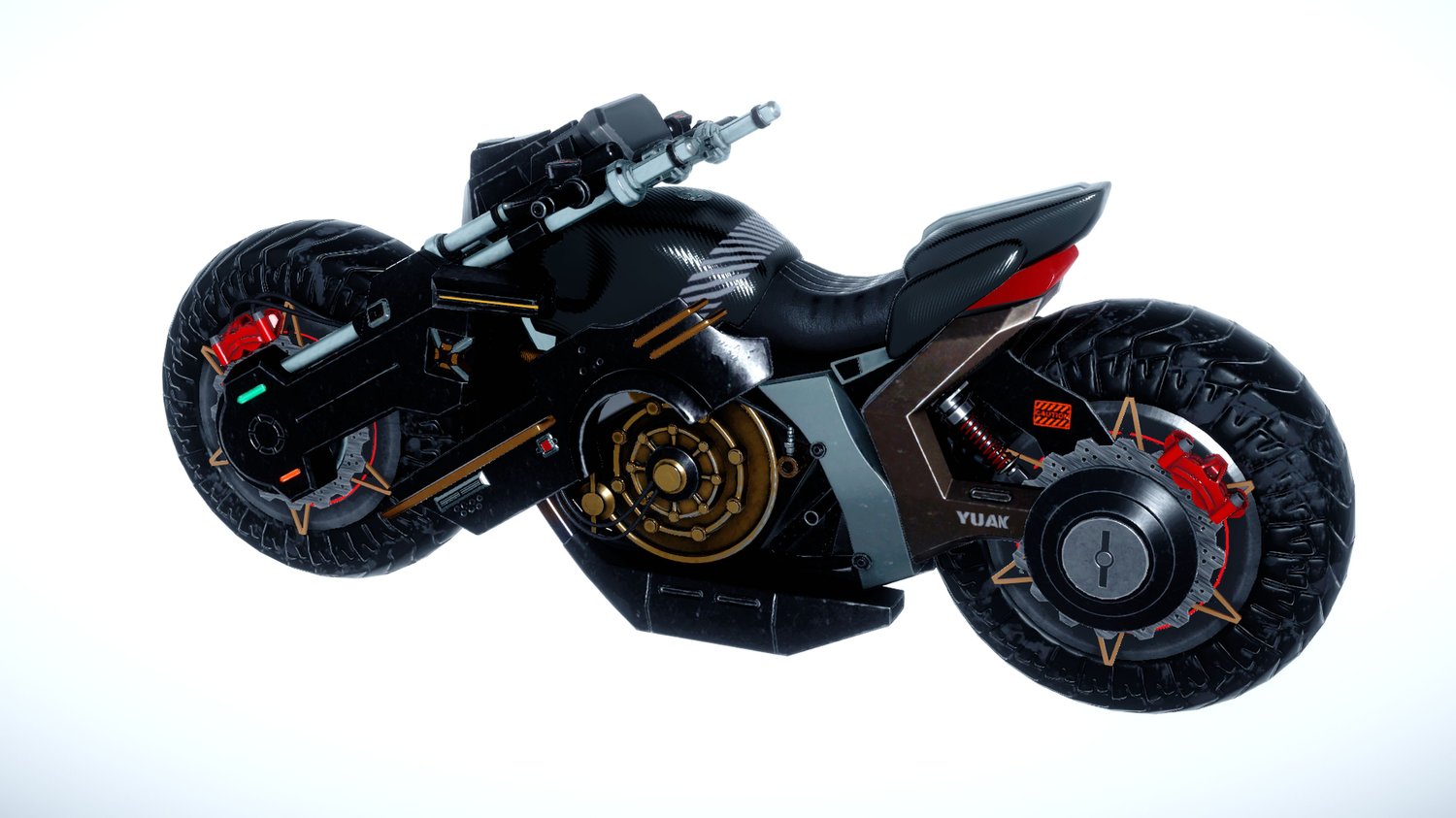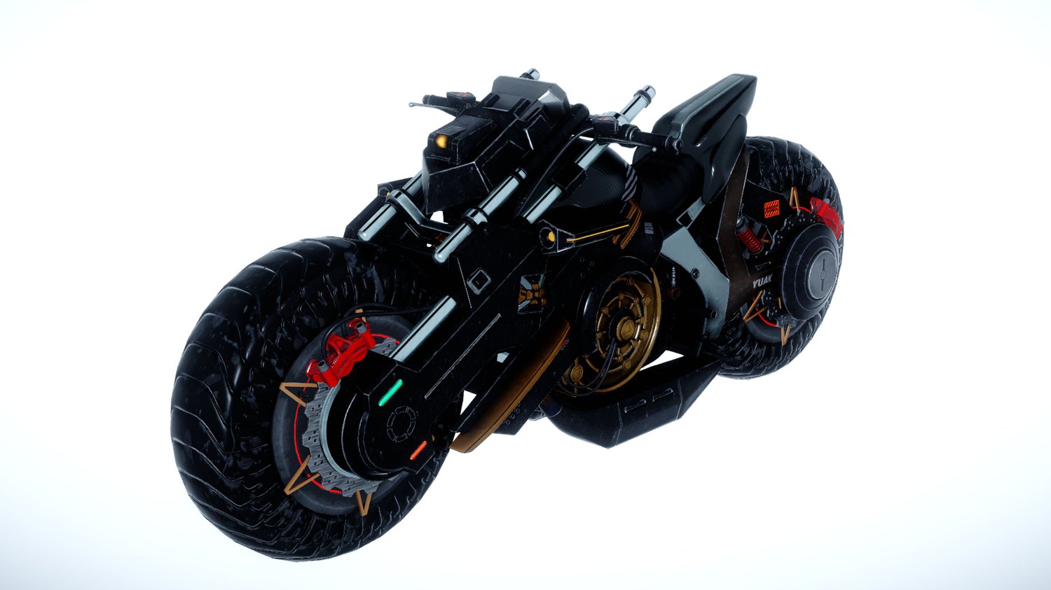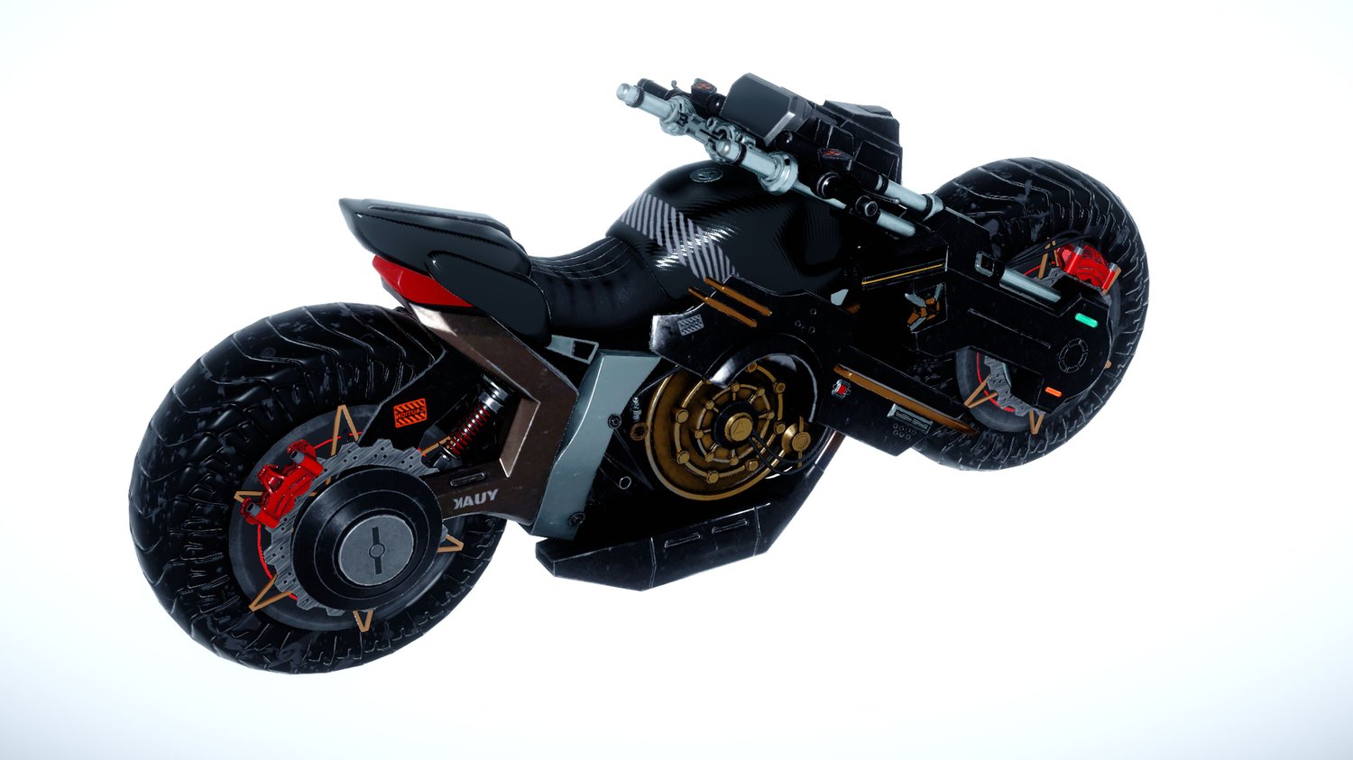 Technological Aesthetic: With a bold appearance and visible components, this motorcycle stands out in futuristic and science fiction-themed scenes.