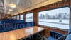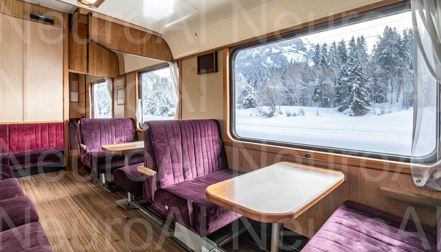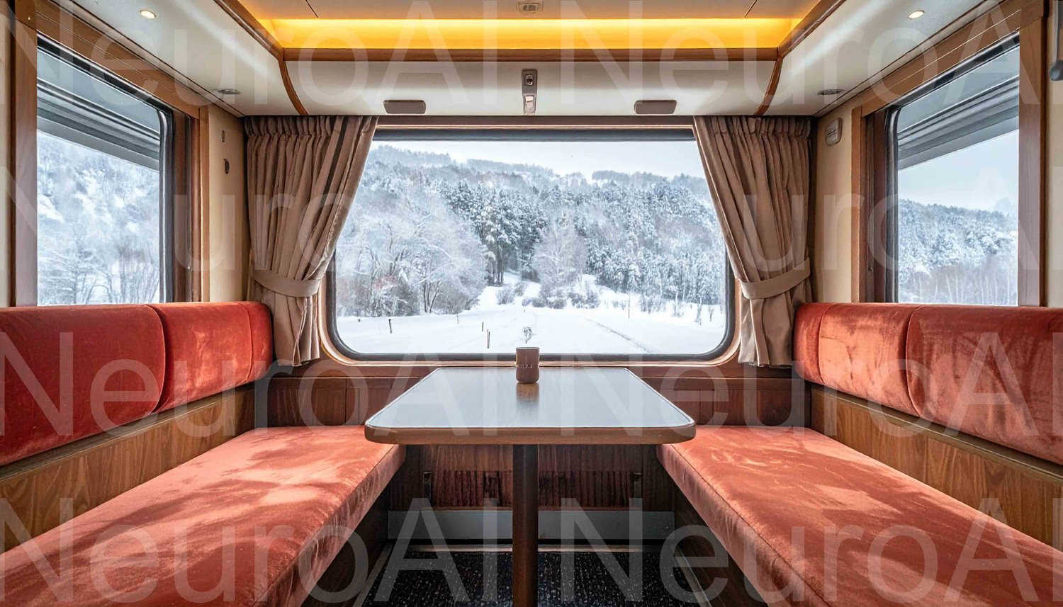 Elegant train car travels through snowy landscape