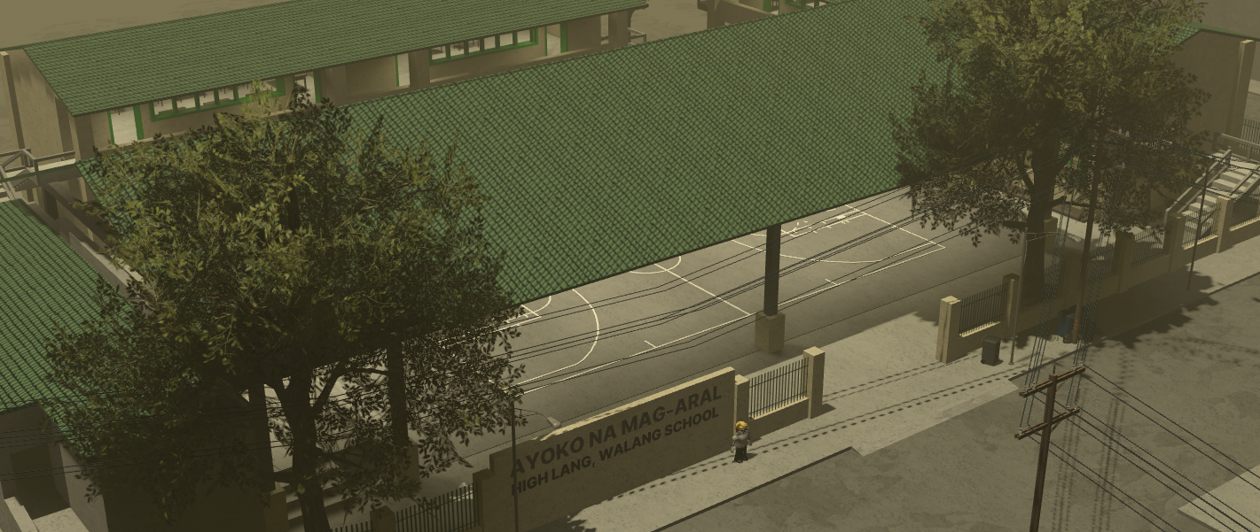Realistic barangay-inspired layout with tricycles, basketball courts, and overpasses