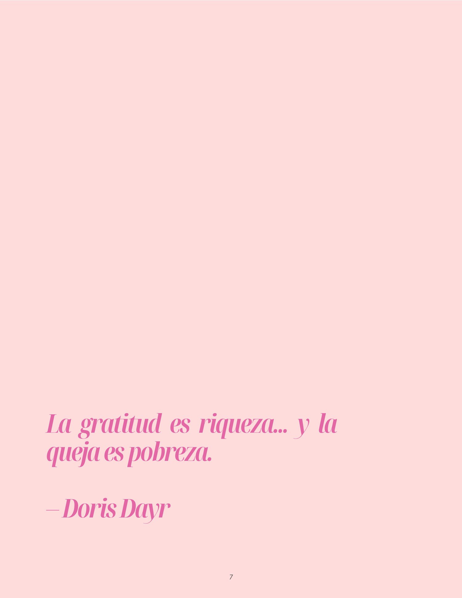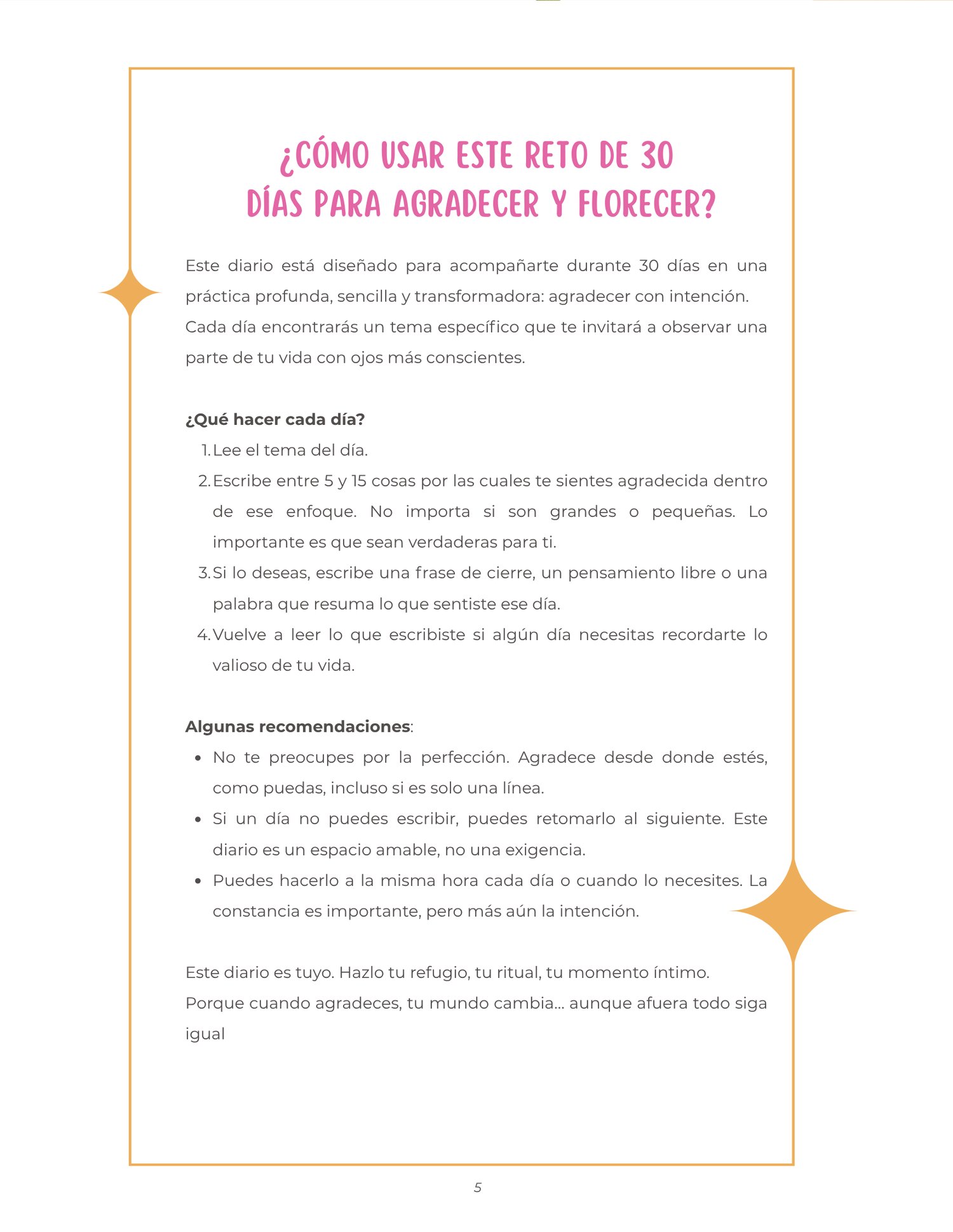 Cada día encontrarás un tema diferente que te invitará a reflexionar y escribir entre 5 y 15 motivos de gratitud, desde tu cuerpo y tus vínculos, hasta tus logros, sueños y los pequeños detalles cotidianos que a menudo pasan desapercibidos.