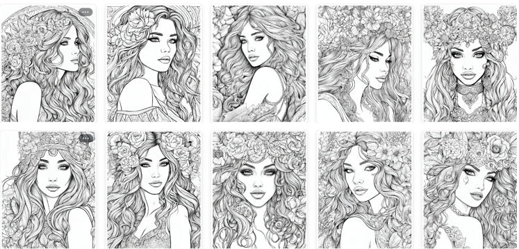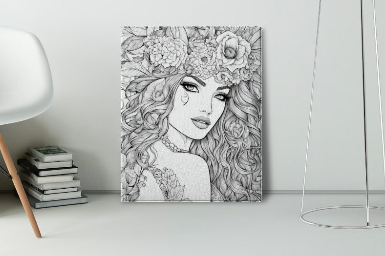 Experience the beauty of Risya Moon's monochrome canvas portrait featuring a stunning lady with a flower in her hair. Shop now and bring this captivating printable artwork to your home, adding a touch of elegance and grace. Enhance your living space with Risya Moon's unique and timeless art! 🖼️🌿 #RisyaMoonArt #ShopNow #PrintableProducts
