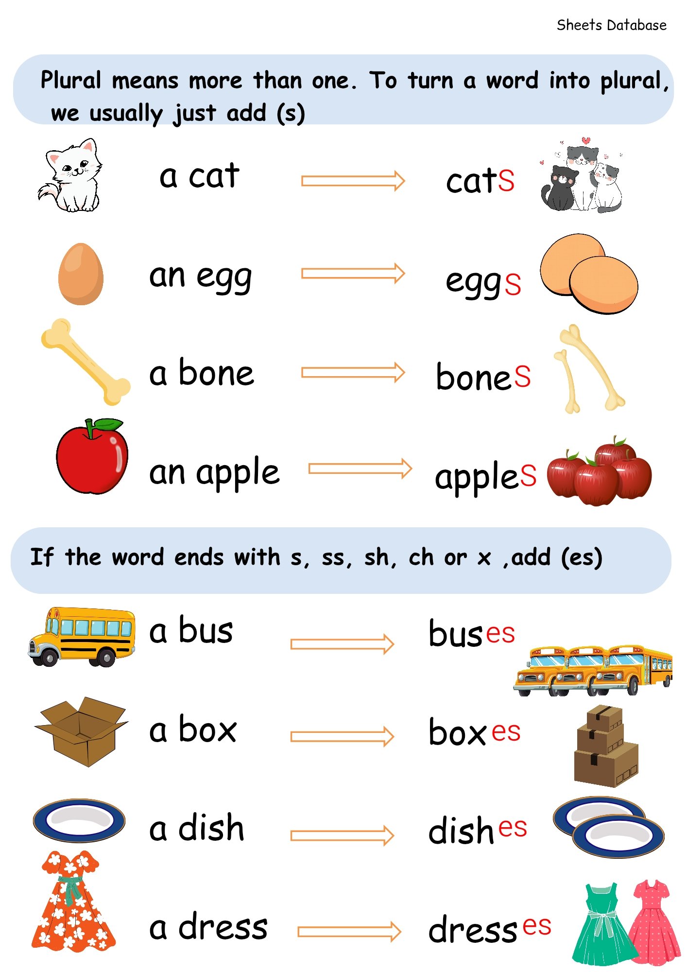 Includes rules for -s, -es, -ies, -ves, and irregular plurals, with examples and practice activities.