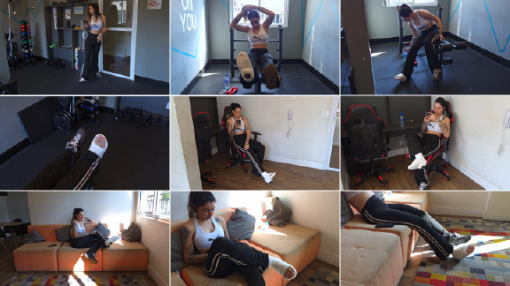Rebeca heads to the condo's gym for some strength training. Then she heads to the game room, sits in a gaming chair, and plays with her phone. Finally, she relaxes on the game room couch and takes the opportunity to show off her cast and wiggle her toes.