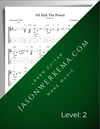 Fingerstyle guitar arrangement of "All Hail The Power" (level 2) with music notation, left-hand fingerings, chord symbols, TABs, and mp3 file.