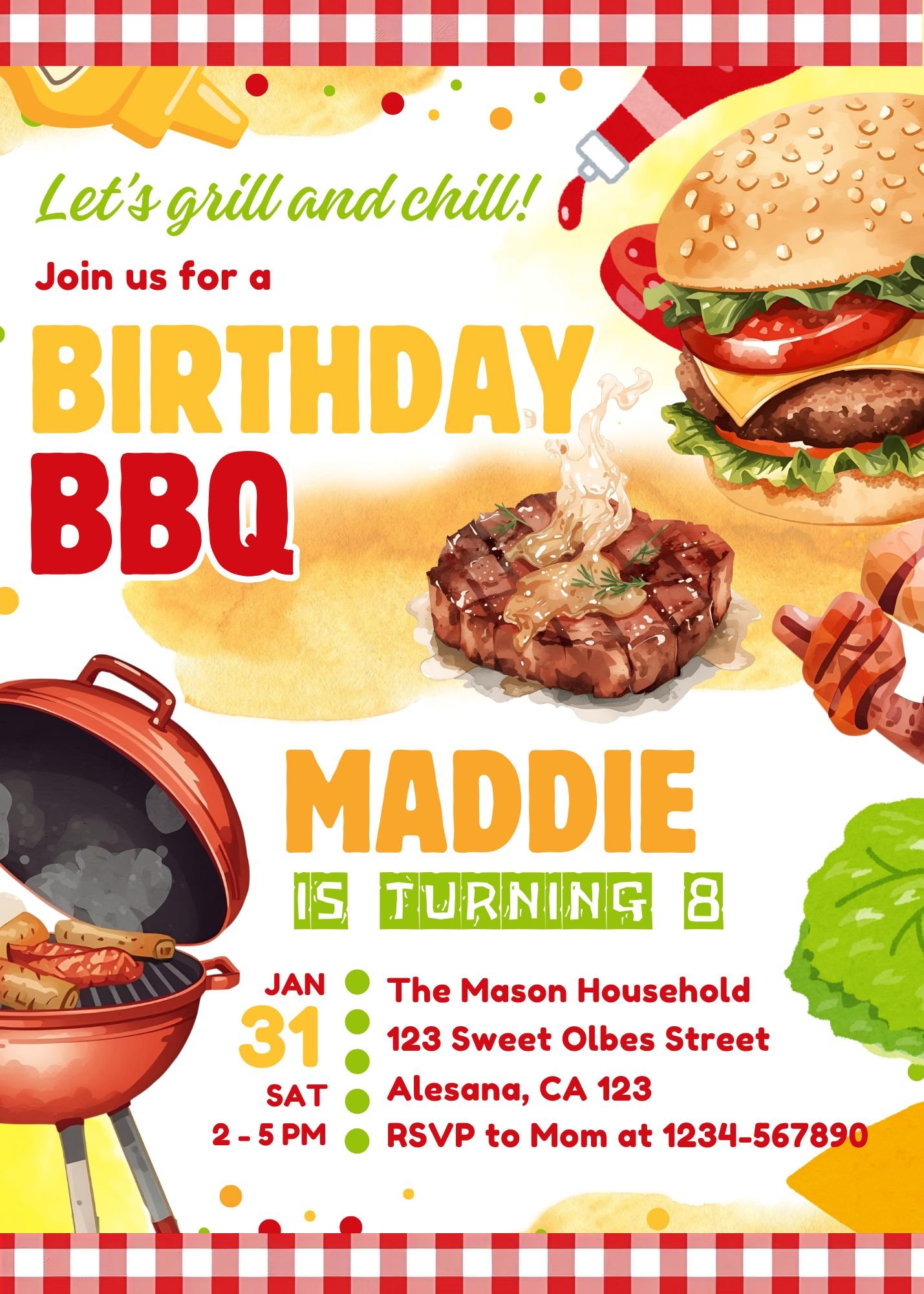BBQ Chill and Grill Birthday Invitation, Trendy BBQ Party Invite, Digital Birthday Invite Any Age, Editable Digital BBQ Invitation Gingham