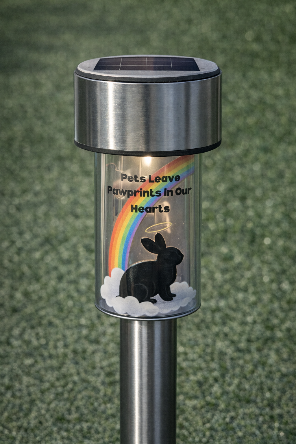 This solar-powered stake features a heartfelt message, "Pets Leave Pawprints In Our Hearts," beautifully printed on a durable, clear cylinder. A serene image of a the animal of your choice from the drop down menu with a halo sits on a cloud beneath a vibrant rainbow, symbolizing their peaceful journey to the rainbow bridge.
