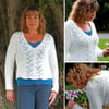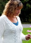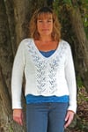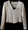 Rated: intermediate; knit/purl, inc/dec, lace pattern, keep continuity of pattern, pick up sts, work in round for neckband only, seaming