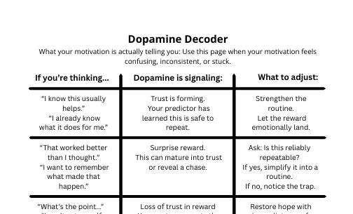 Using visual science maps, freeze/flight check-ins, reward predictor reflections, and a real-time dopamine decoder, this guide helps you understand what your brain has learned to expect from effort, reward, relief, and disappointment.
