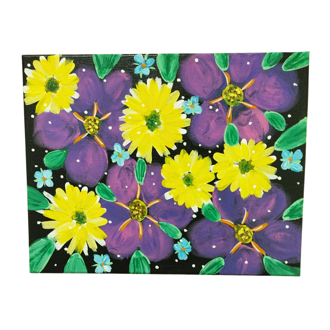 painting of flowers on a black background. (Blue-eyed grass, Black-eyed susans, poppies) on medium 11x14 canvas. Perfect for wall hanging.