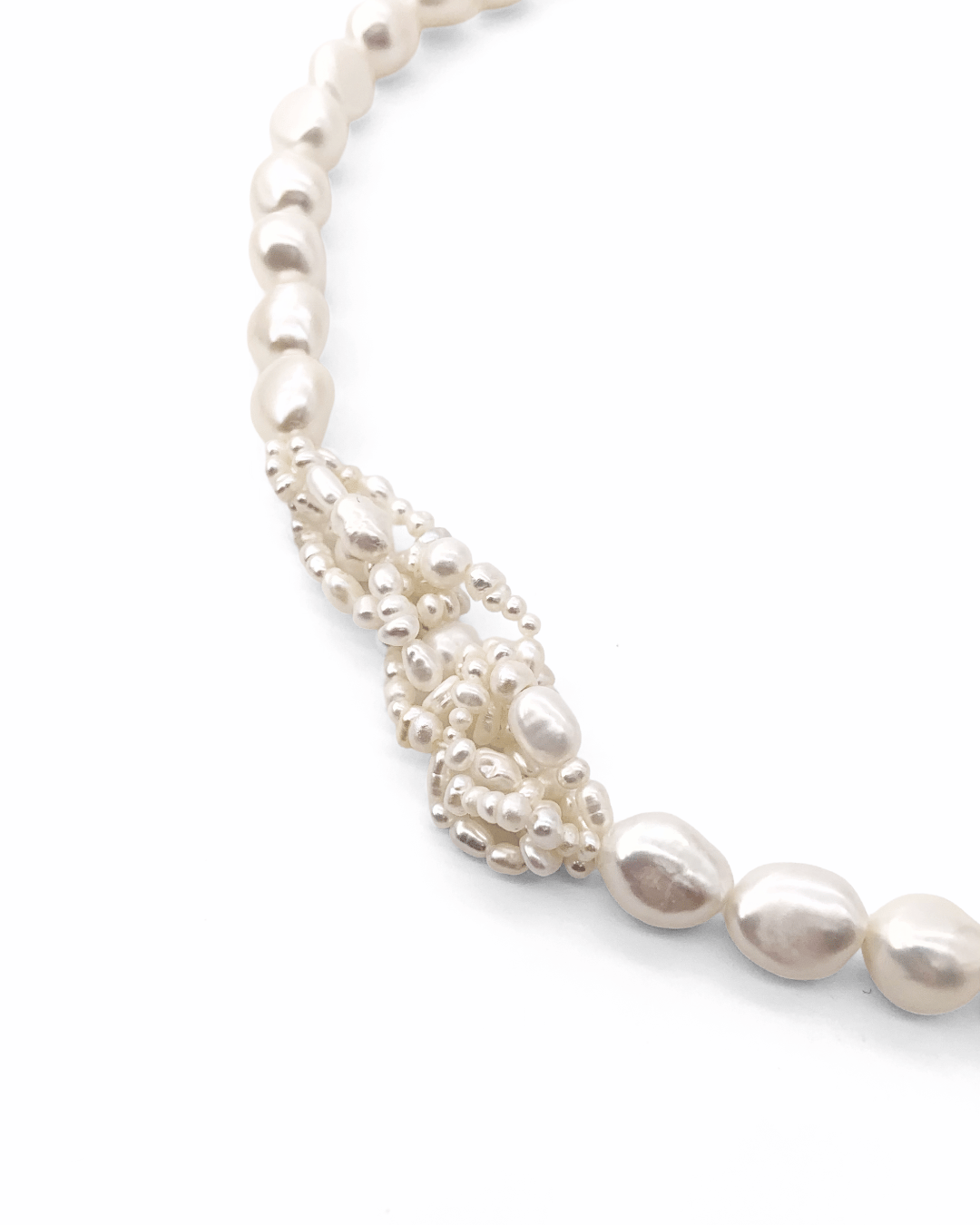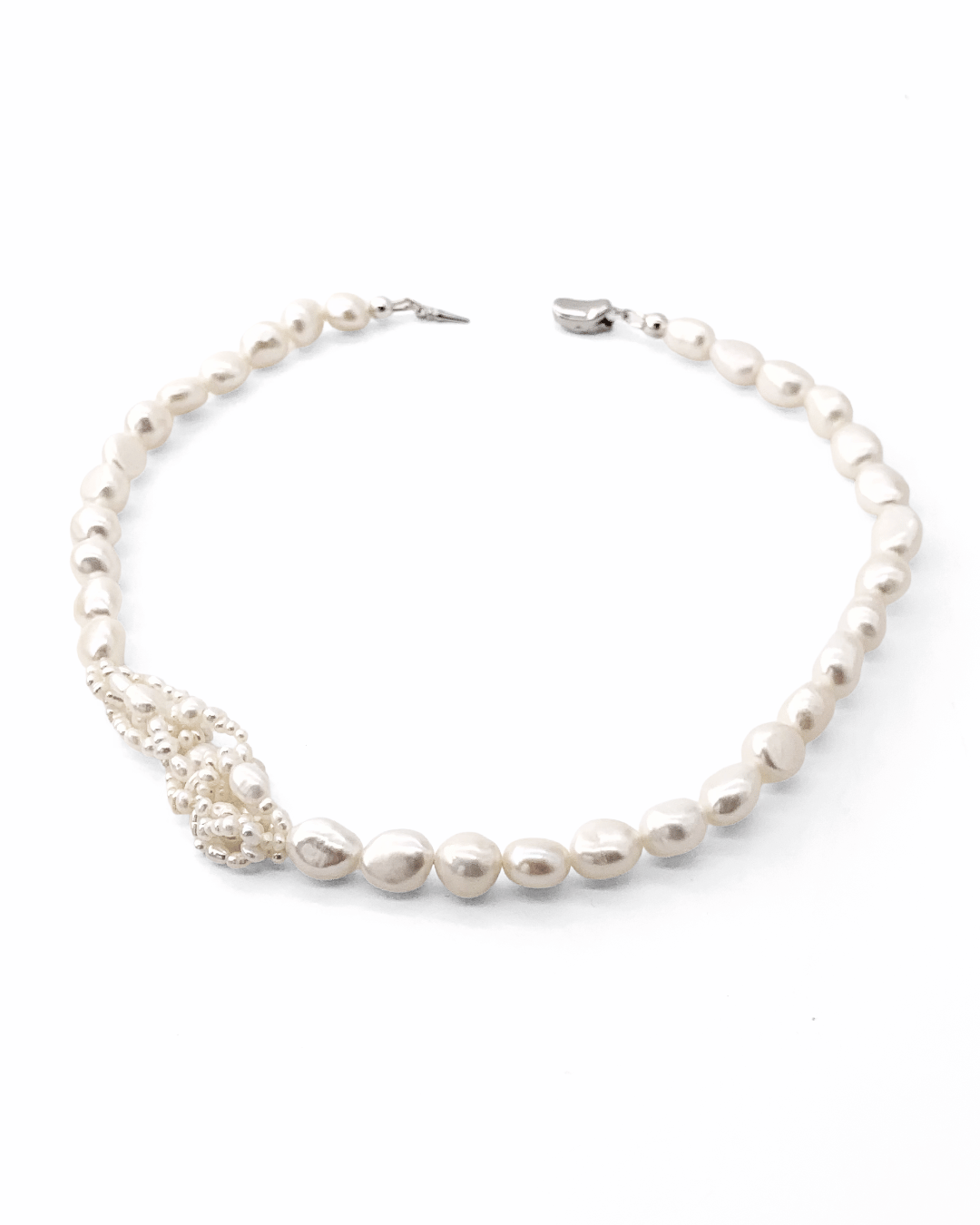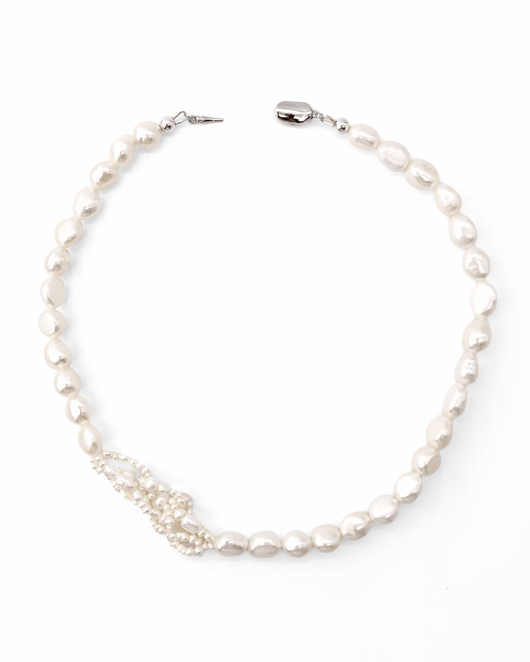 A subtle twist on the classic pearl necklace—an off-center cluster of tiny seed pearls adds rhythm and quiet distinction. Soft yet defined, it speaks in understatement.