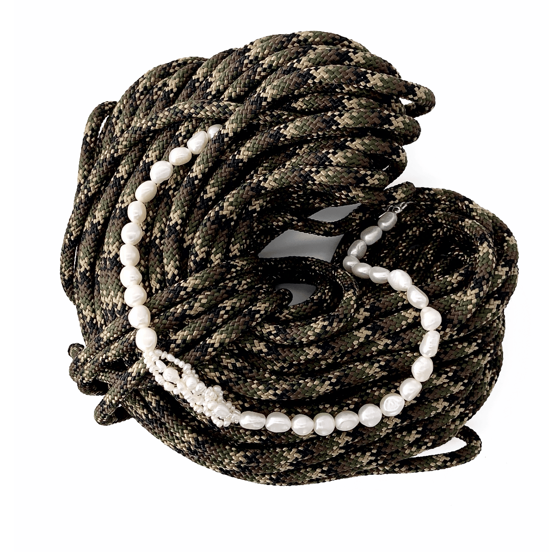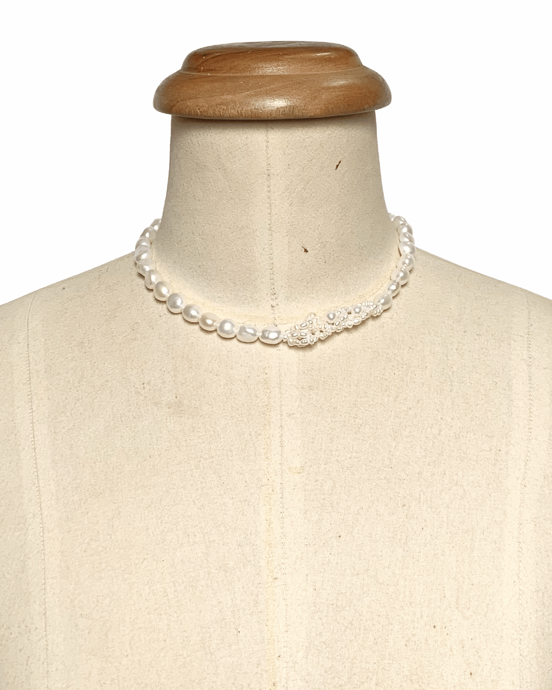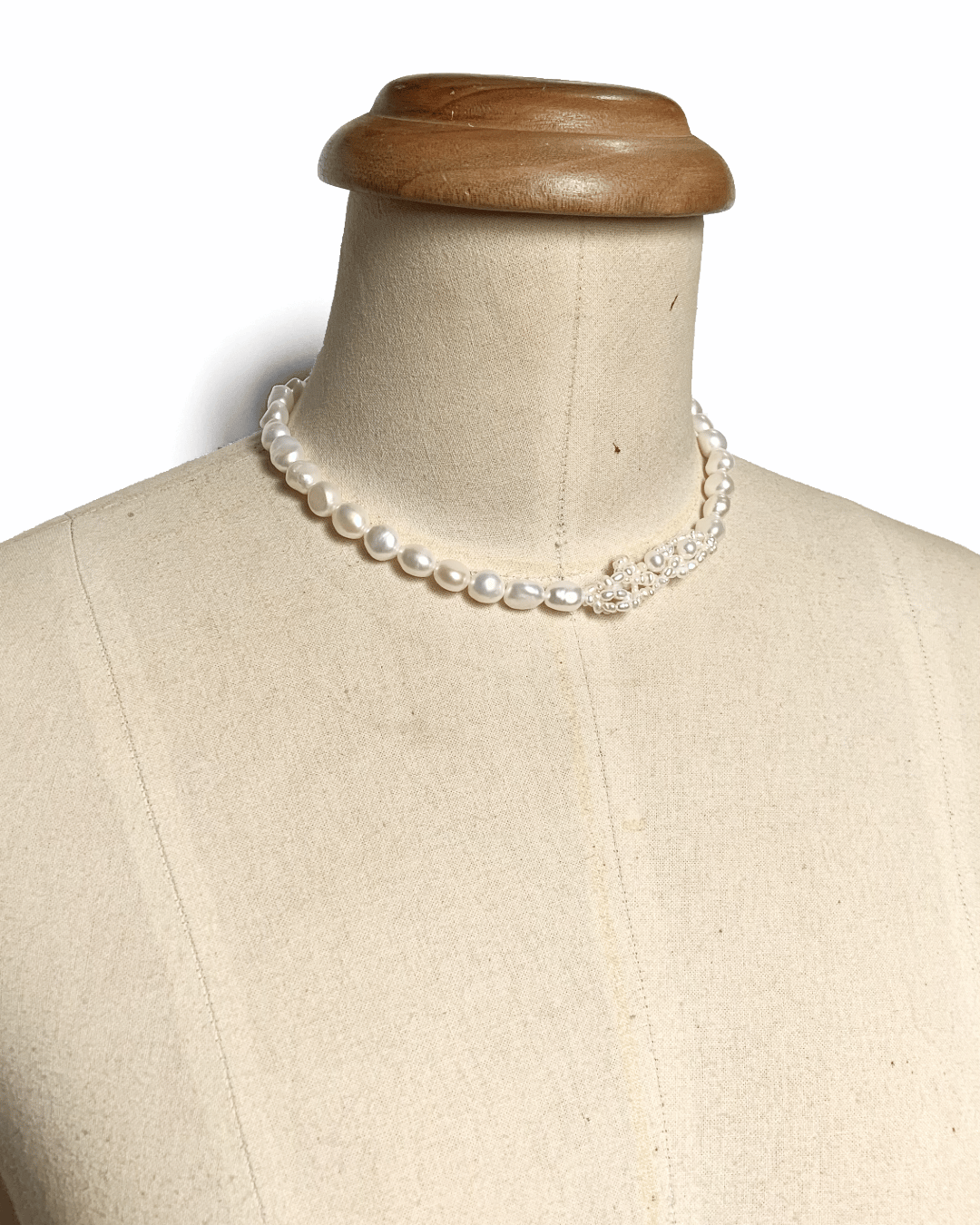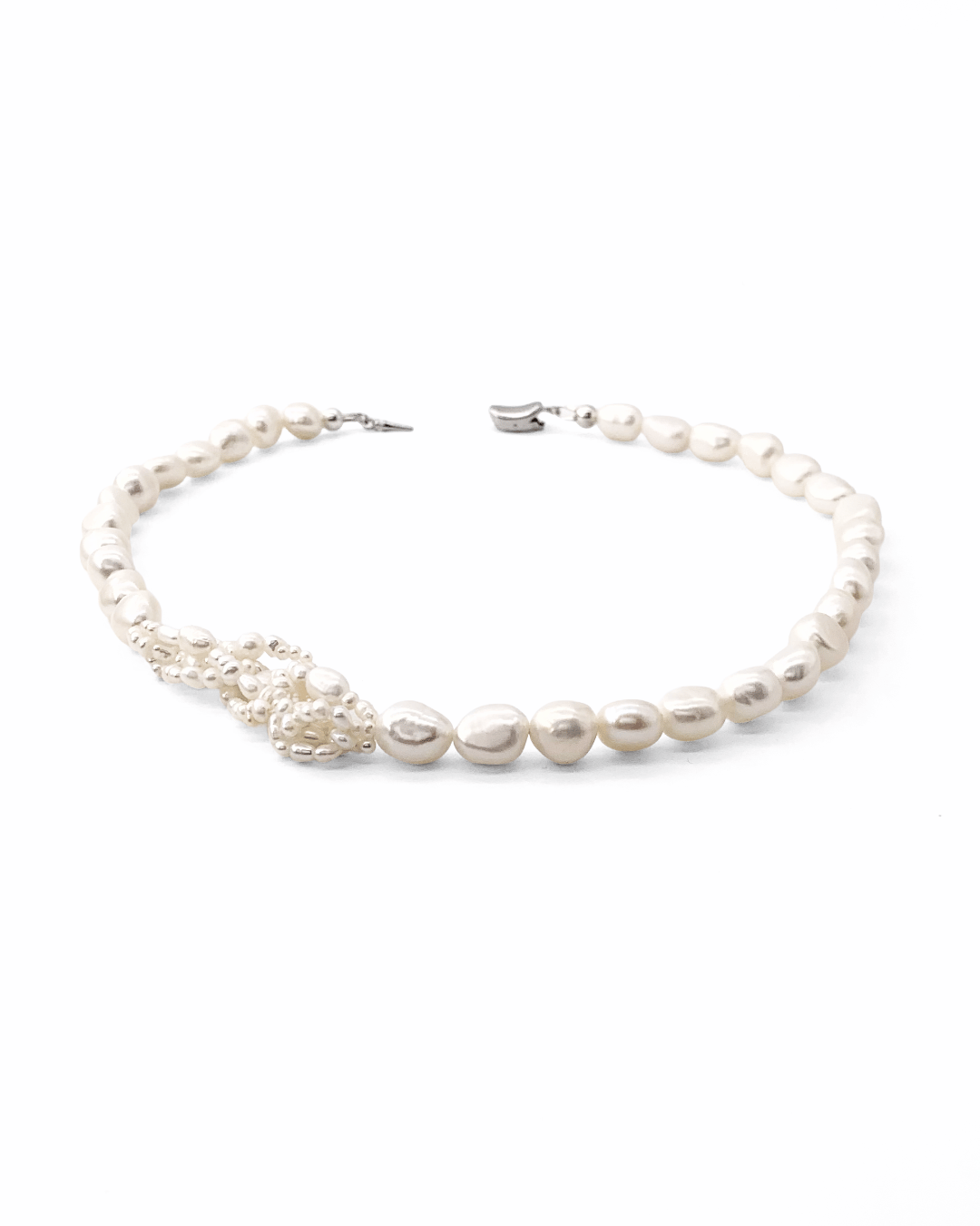 A subtle twist on the classic pearl necklace—an off-center cluster of tiny seed pearls adds rhythm and quiet distinction. Soft yet defined, it speaks in understatement.