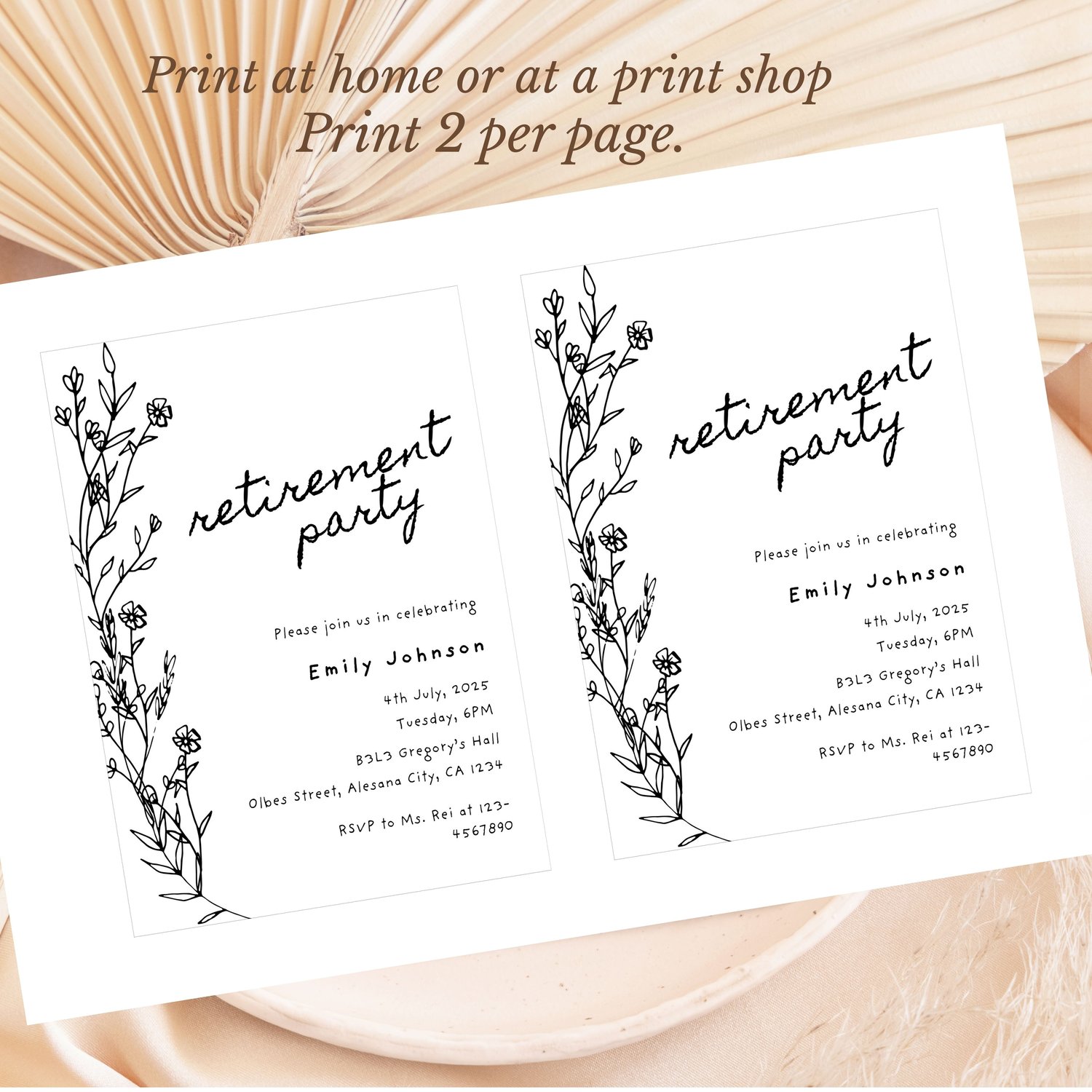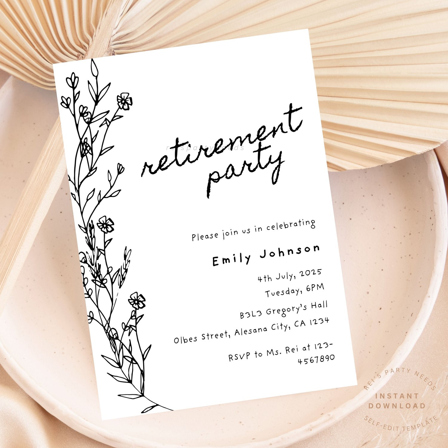Editable Hand Drawn Retirement Invitation Template, Simple Retirement Party Floral Invite, Scribble Fussy Illustration Wild flower Invite