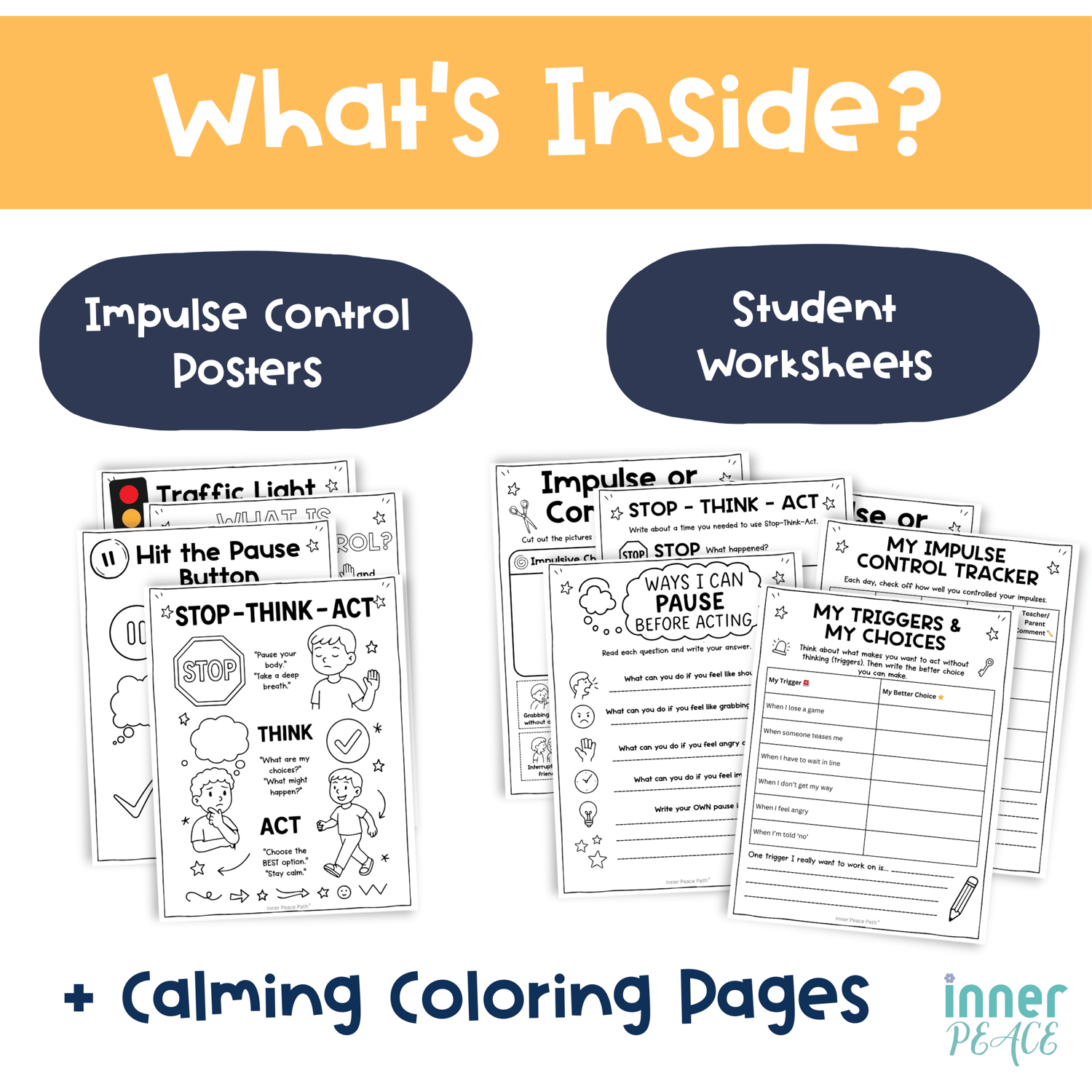 This 24-page resource includes a variety of impulse control worksheets, activities, and coloring pages that teach kids how to stop, think, and make better choices. Perfect for SEL lessons, counseling, or classroom management.