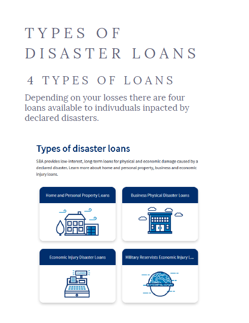SBA disaster loans can cover your home, personal property, business economic injuries and losses experienced by military reservist.