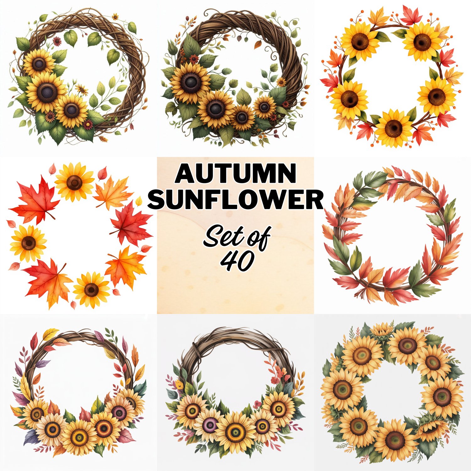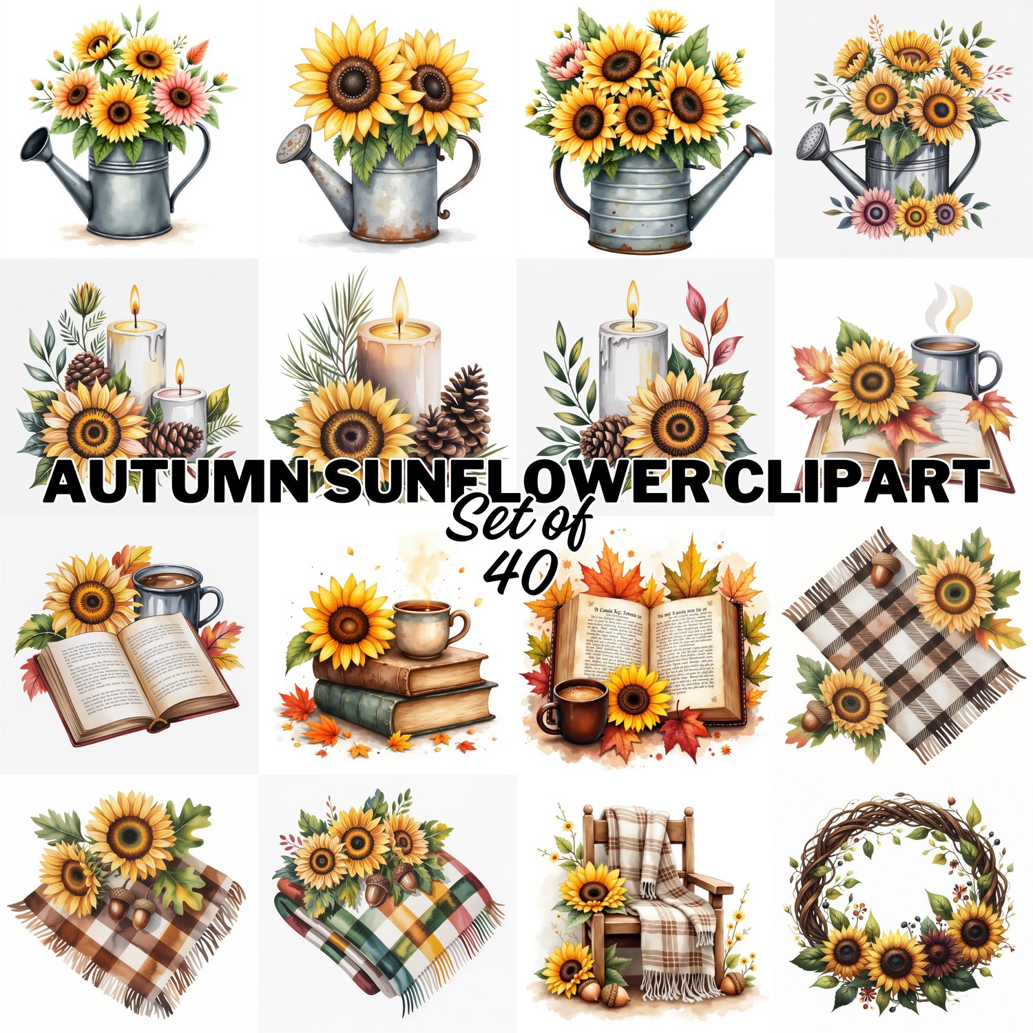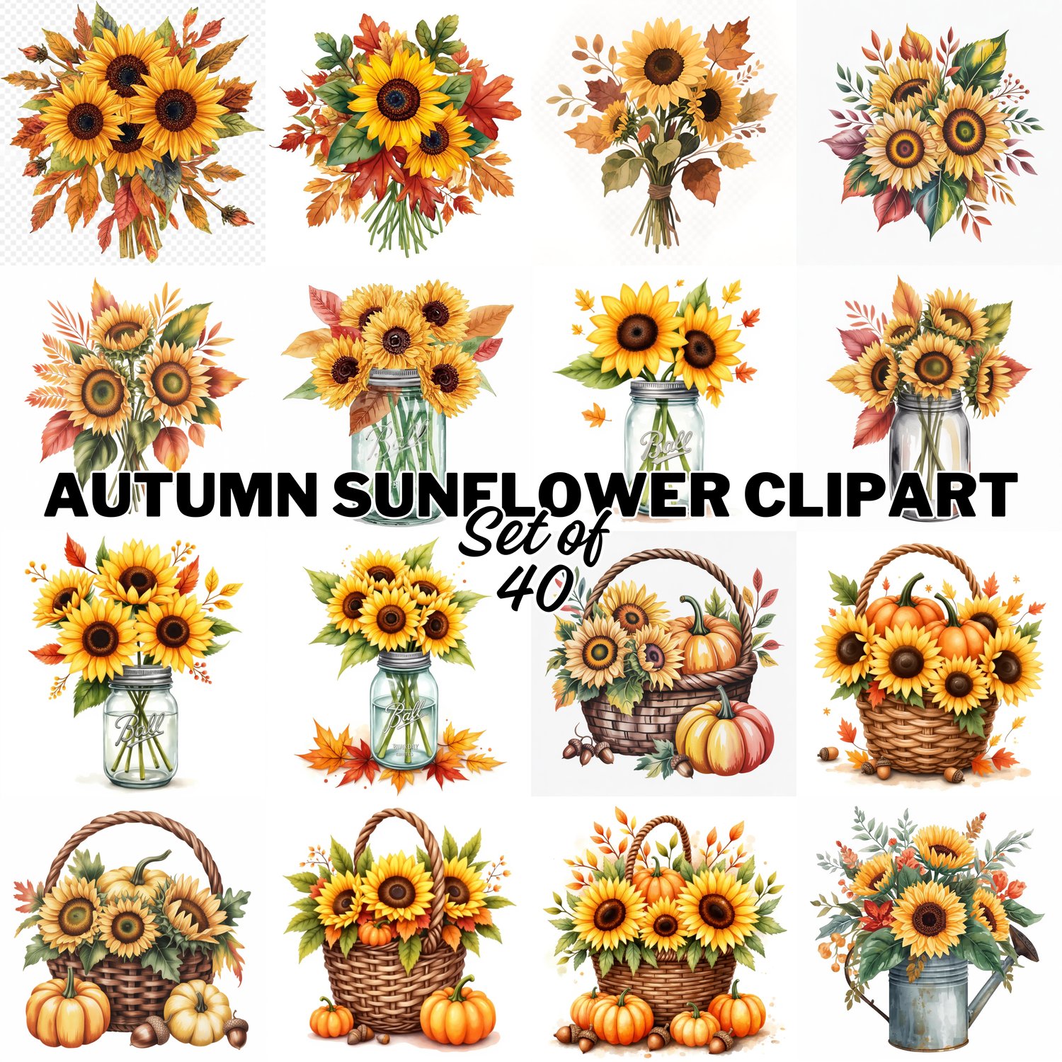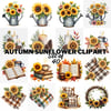 Set of 40 Rustic sunflower, autumn watercolor_clipart PNG