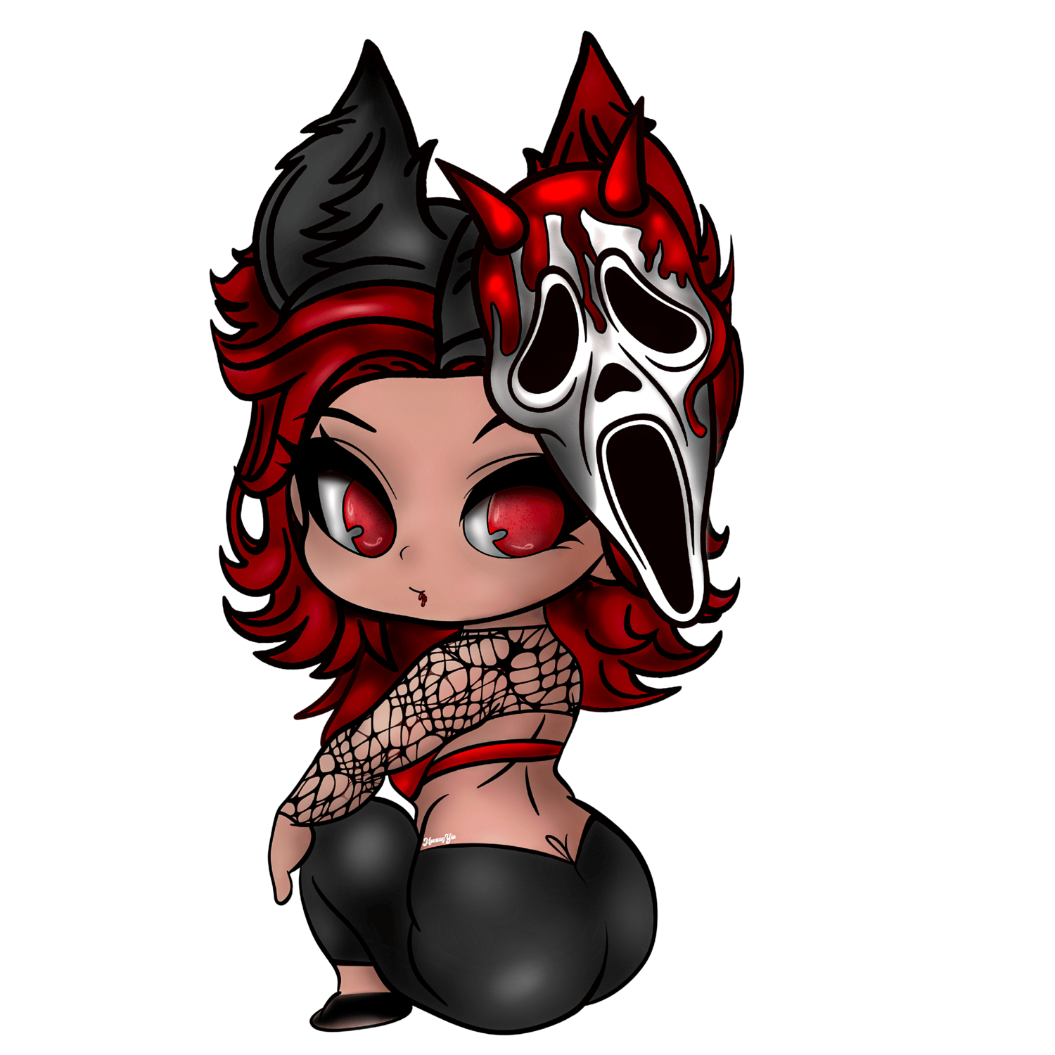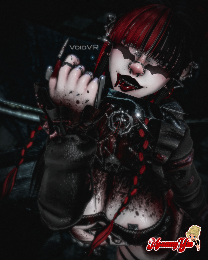 - 24 Accessories ( Pincher Gauges, Head Knife, Blood Waist Chain & necklace, Hand & Butt Knife, Face Piercings, Mr. PP. Boob and cheek Ghostie, Mask ,Glasses, Harness Knife , Harness, 3 Chokers, Bat Garter, Butt Plug, Beaded Cross Necklace, Arm Wraps, Body Piercings, Rings,)