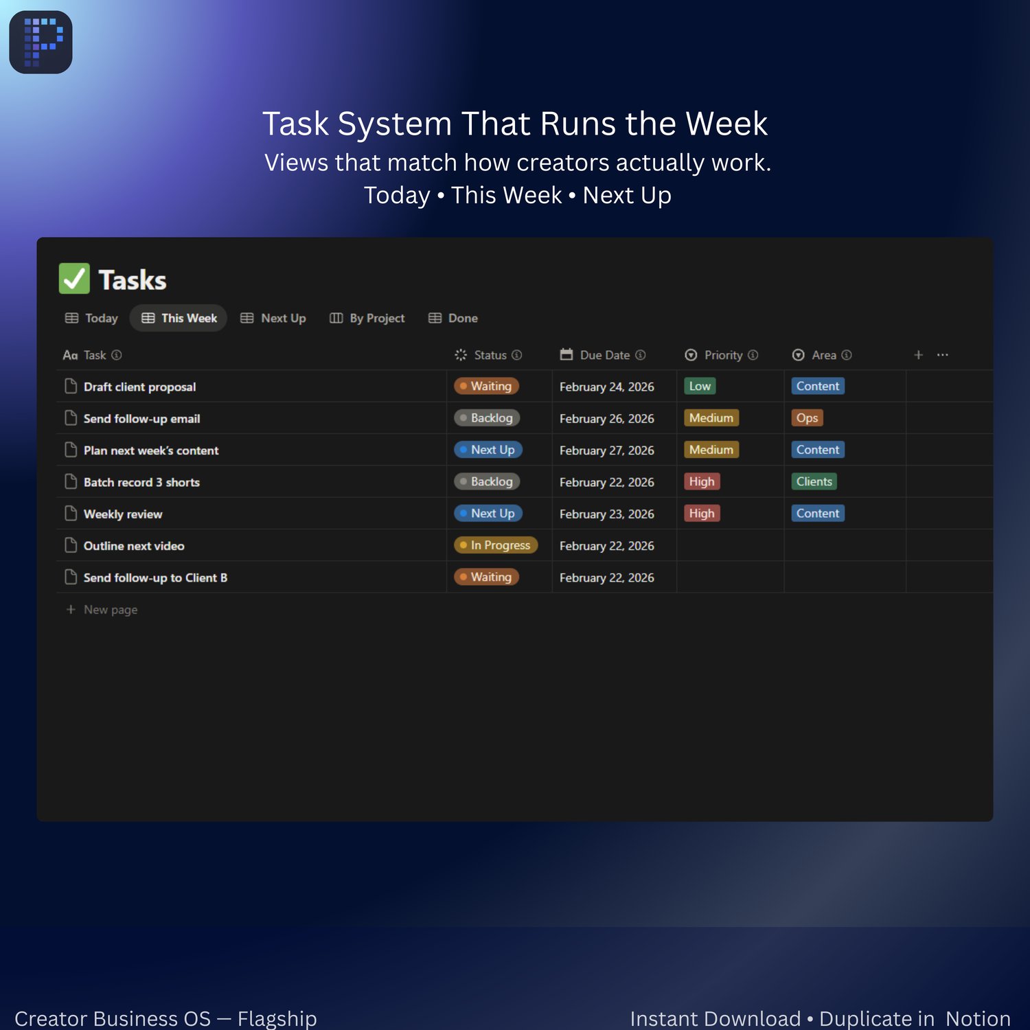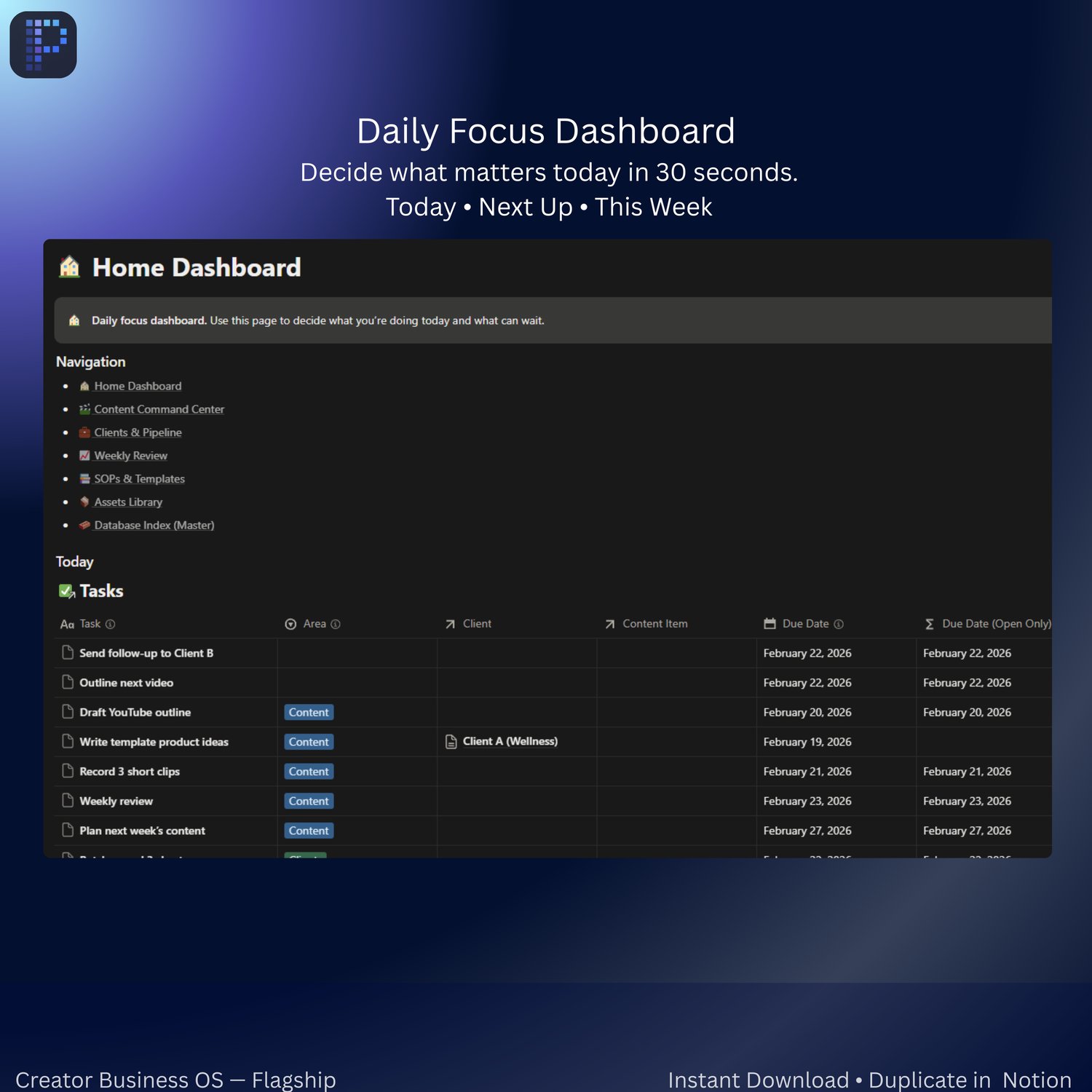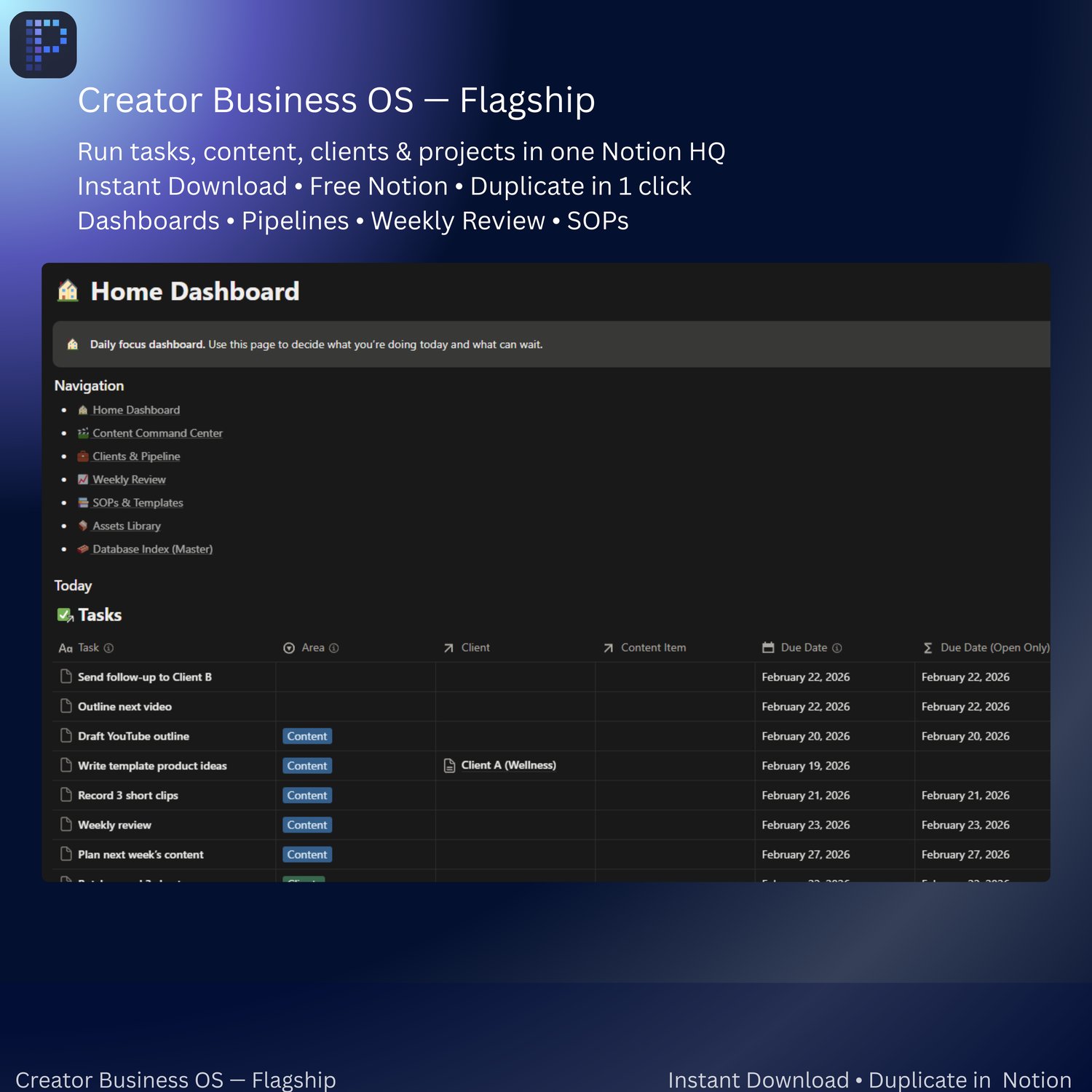 ✅ Run your creator business in one Notion HQ — tasks, content calendar, client pipeline, projects, assets + a weekly reset.
