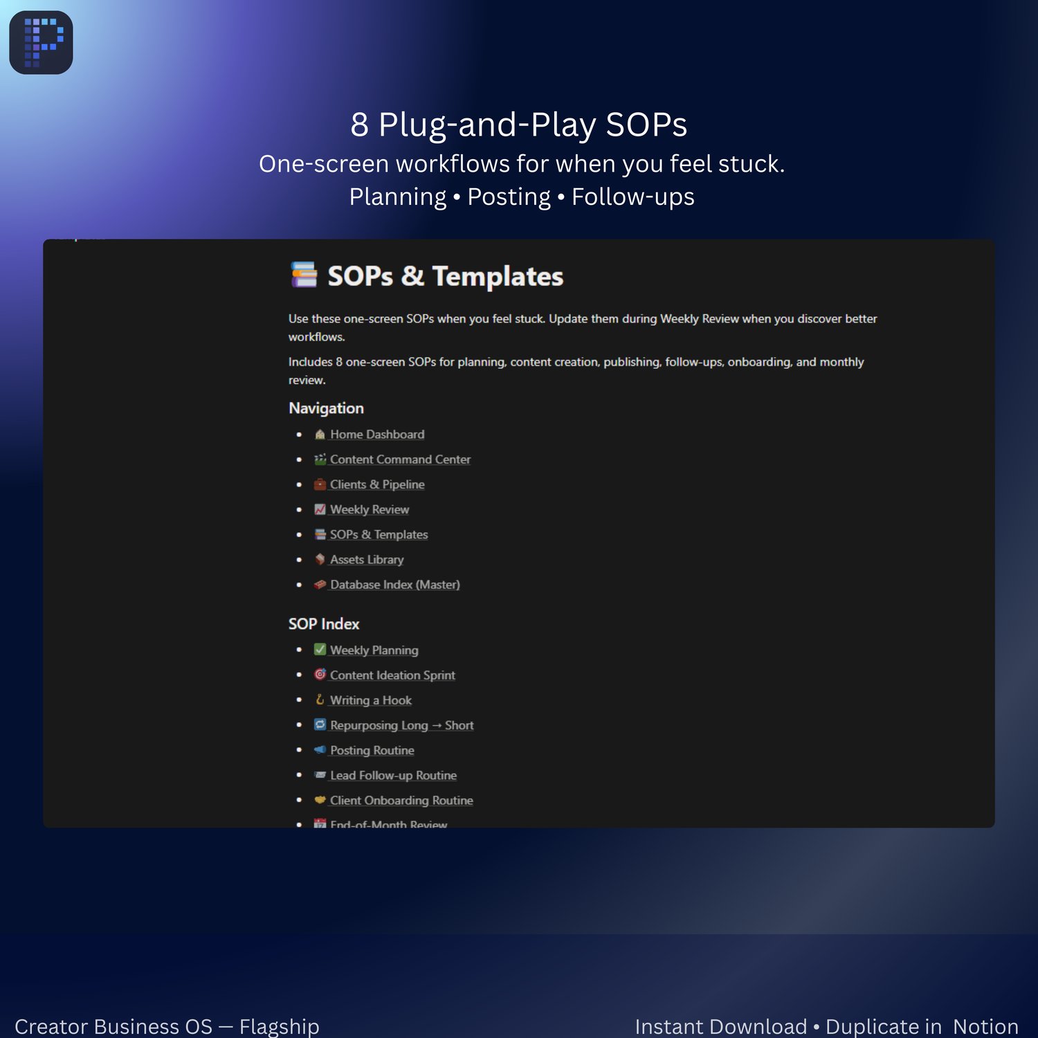 - SOPs & Templates (8 one-screen workflows)