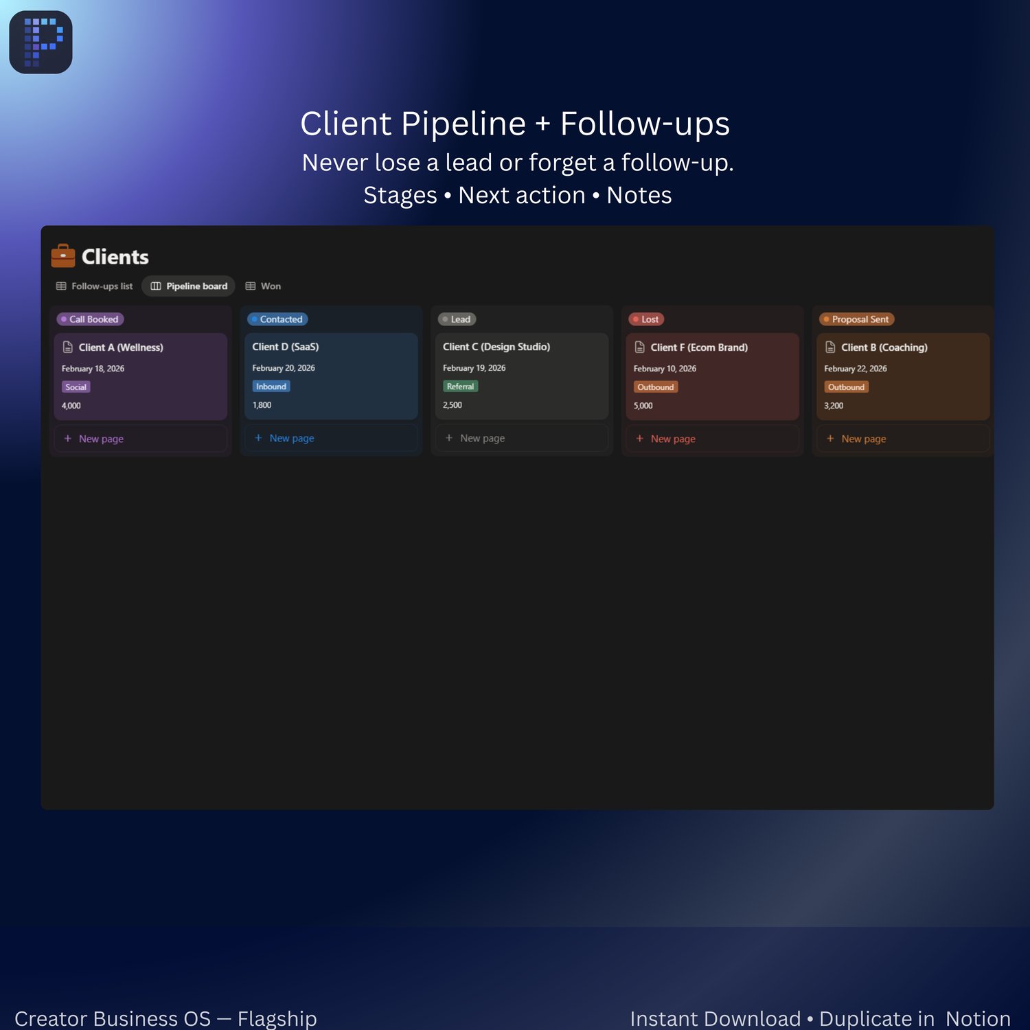 - Clients & Pipeline (stages + follow-ups)
