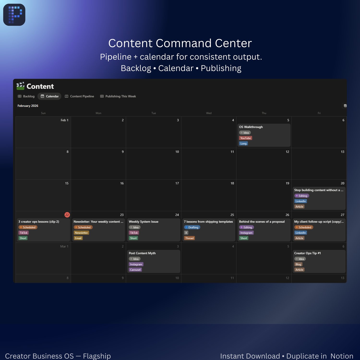 - Content Command Center (pipeline + calendar)
