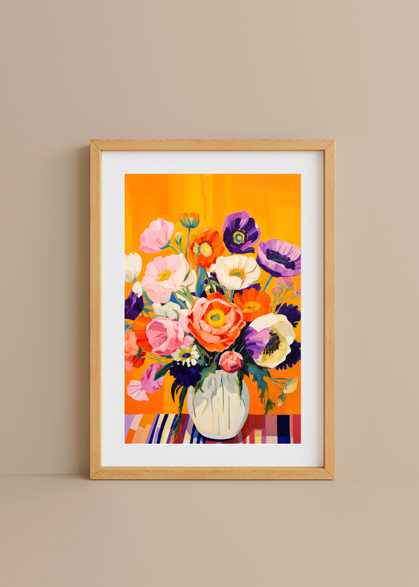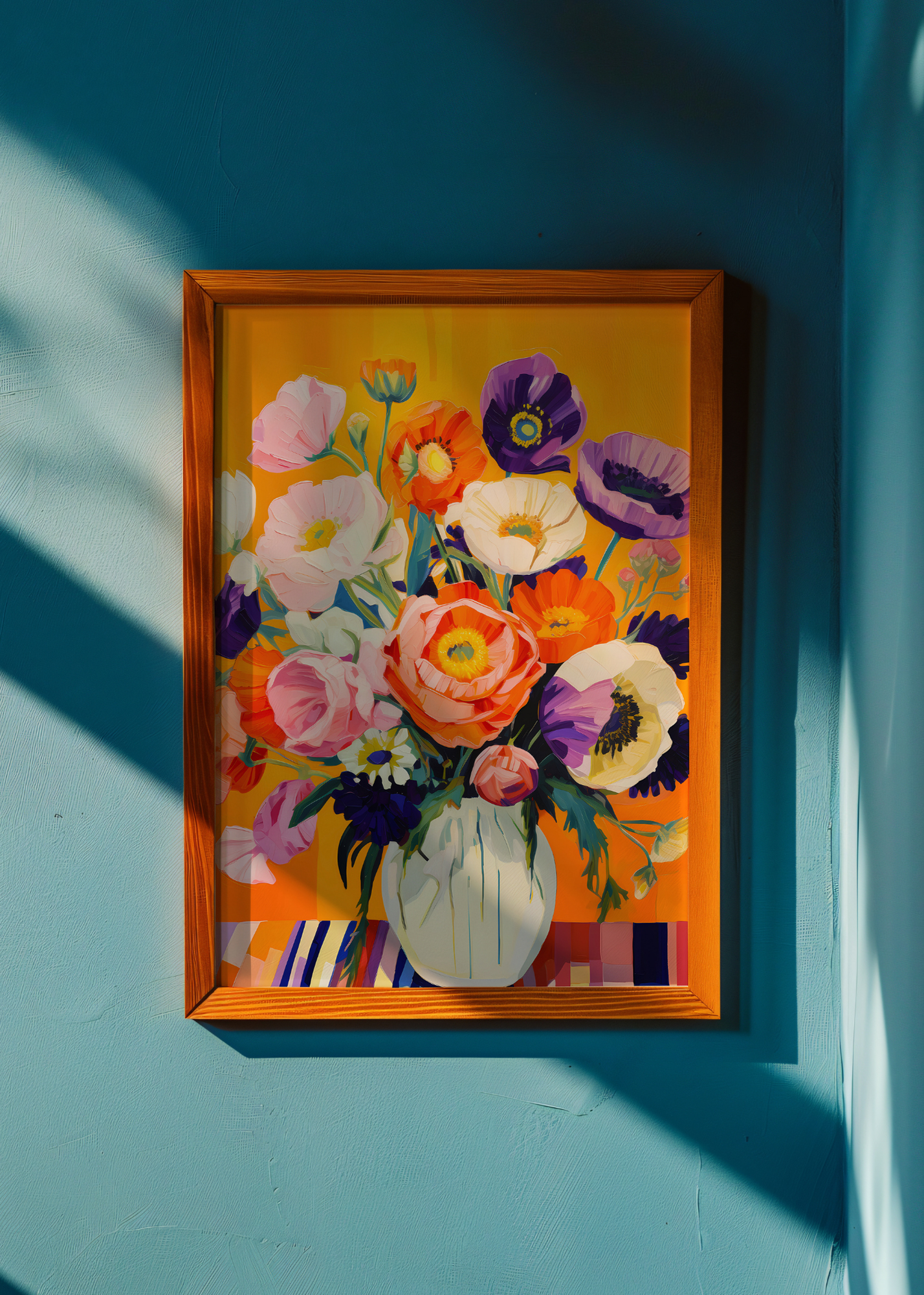 Golden Hour Petals— Bathed in warm amber light, this bouquet radiates with the richness of late summer. Creamy whites and blushing lavenders meet vivid oranges and plums, gathered in a soft, hand-painted vase. This piece captures a moment of golden calm, captured in full bloom.