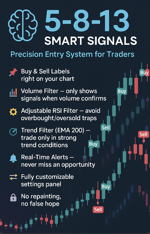 Level up your trading with 5-8-13 Smart Signals — a powerful, intelligent indicator that gives you clean, high-probability buy and sell signals, filtered by real market momentum.