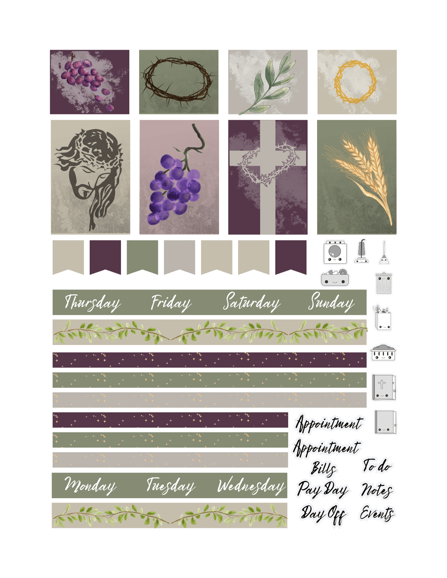 Transform your monthly spread with a rich, Scripture‑rooted theme inspired by the Crown of Thorns, the quiet Garden of Olives, and the Eucharistic symbols of grapes and wheat. Dusty purples, olive greens, and warm browns create a reverent, earthy palette that brings depth and prayerfulness to your Happy Planner Classic.