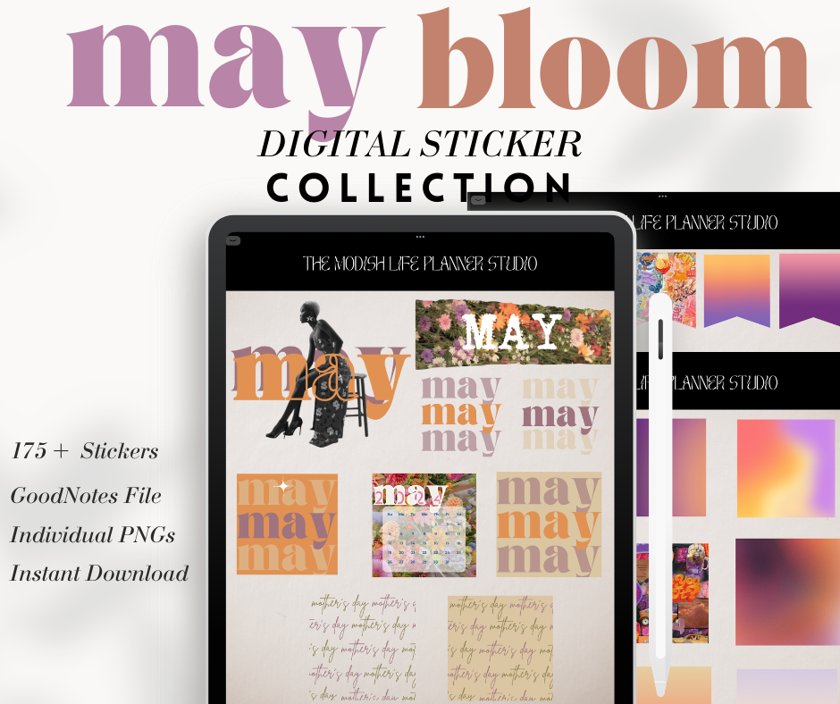 Elevate your digital planning experience with our May Bloom Digital Sticker Collection! This versatile set of 175 plus digital stickers is designed in a trendy bright spring aesthetic, perfect for adding a touch of modern brightness to your digital planner. Delivered as a convenient GoodNotes file with a stylish cover/divider and individual PNGs, these stickers are instantly downloadable, ensuring quick access to enhance your planning creativity. Please note that this is a digital product, and no physical items will be shipped. Dive into the world of effortless digital planning with our May Bloom Digital Sticker Collection today!