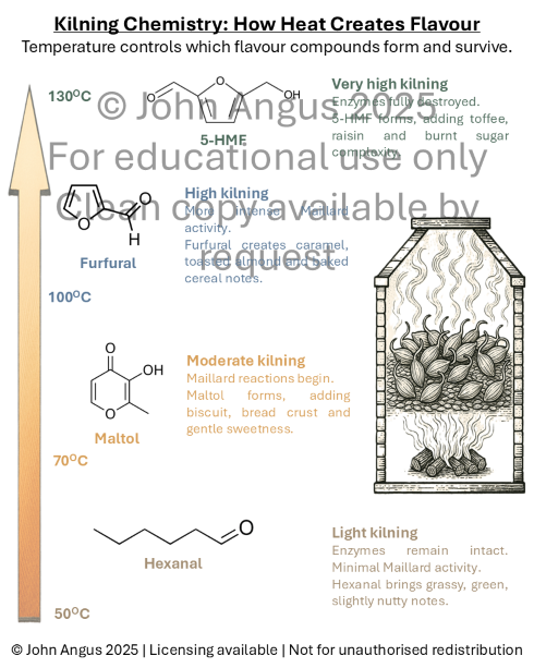 This diagram shows how different kilning temperatures shape the final character of malt — from enzyme preservation to the formation of maltol, furfural and 5-HMF.