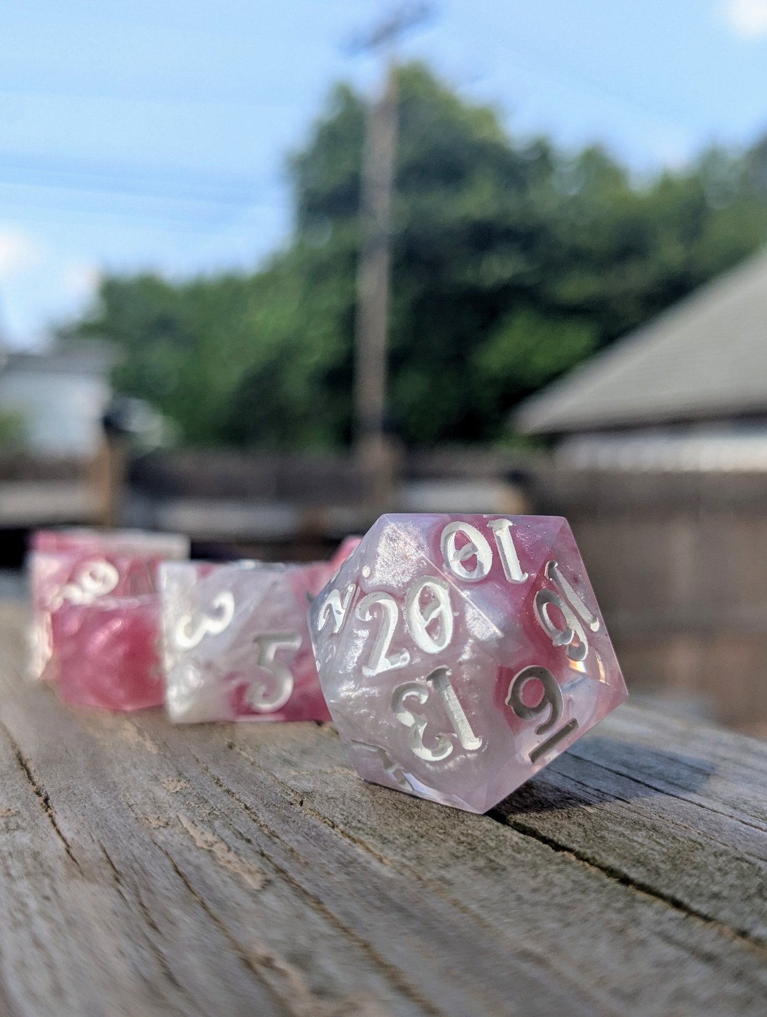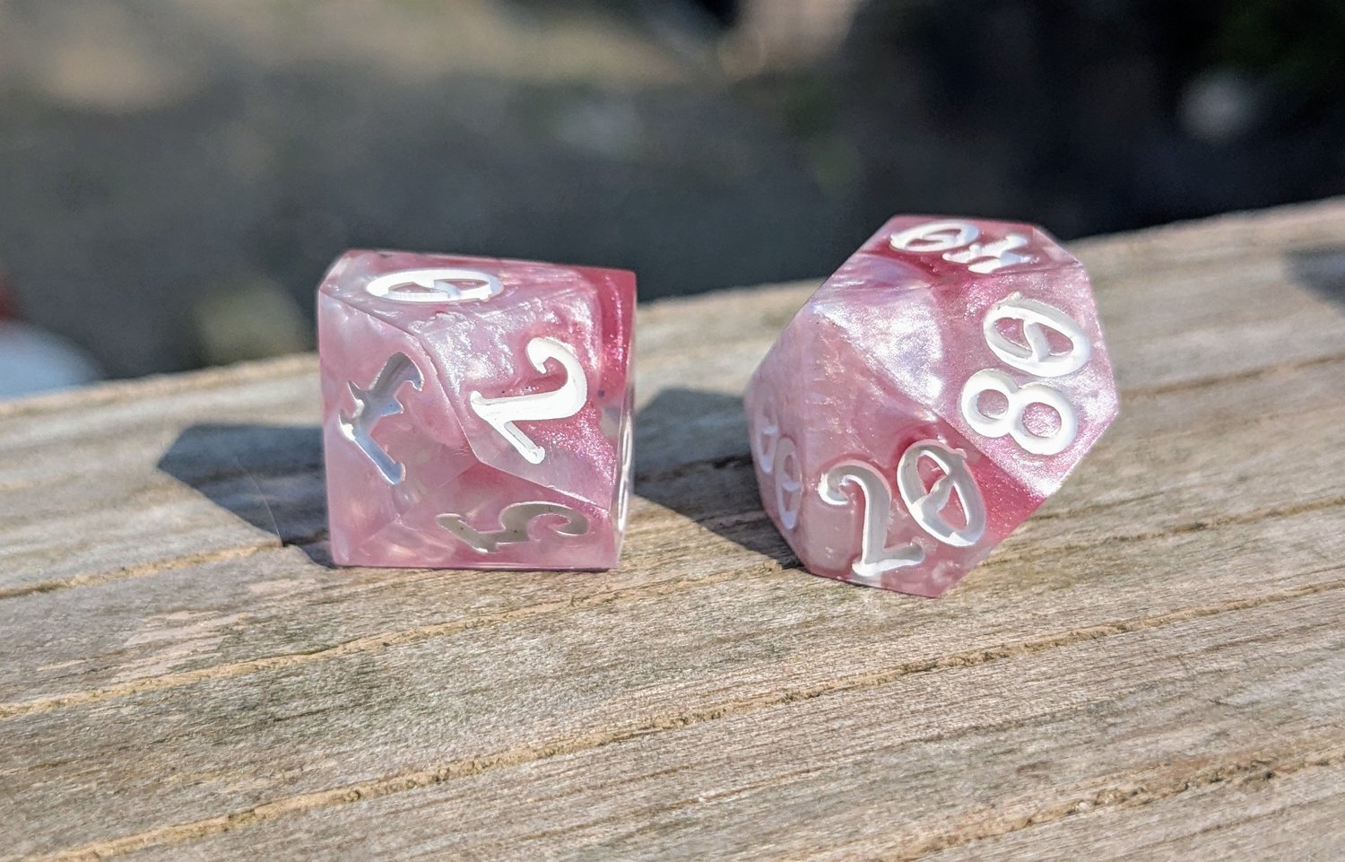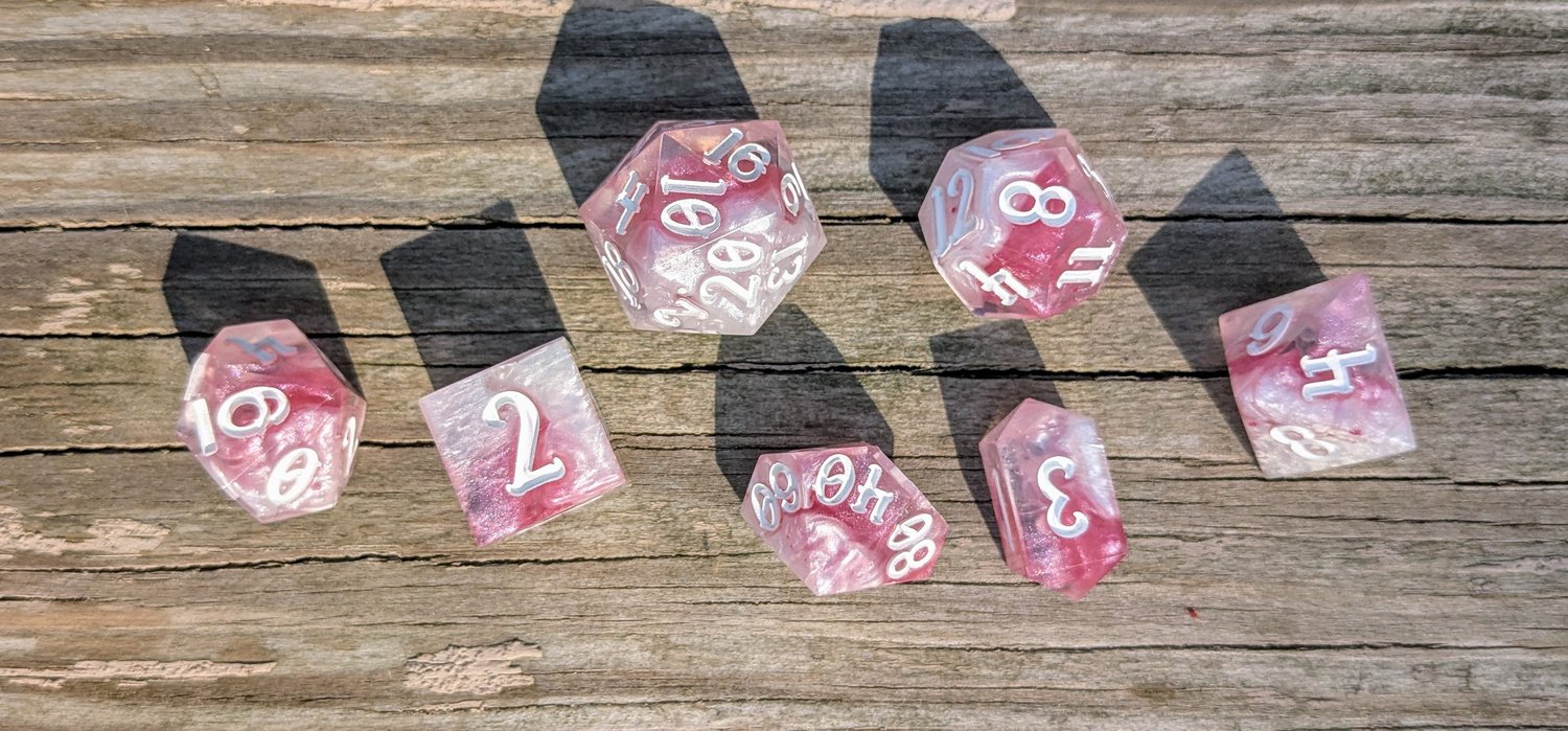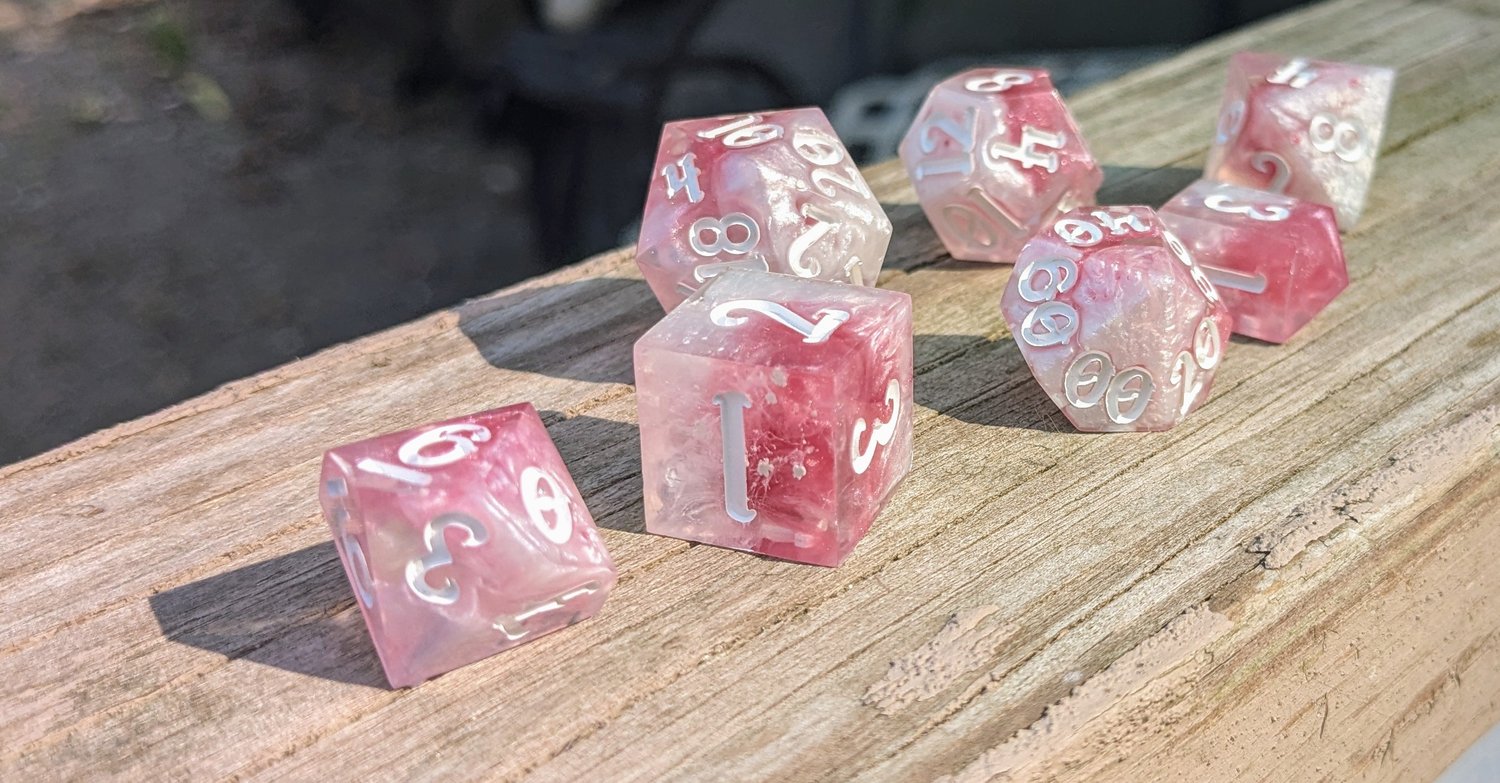 Delicate, daring, and undeniably divine—these dice shimmer like the petals of a magical rose under moonlight. Swirls of soft pink and pearlescent white twist together like enchanted clouds, with crisp white ink for maximum readability. They’re as charming as they are deadly.