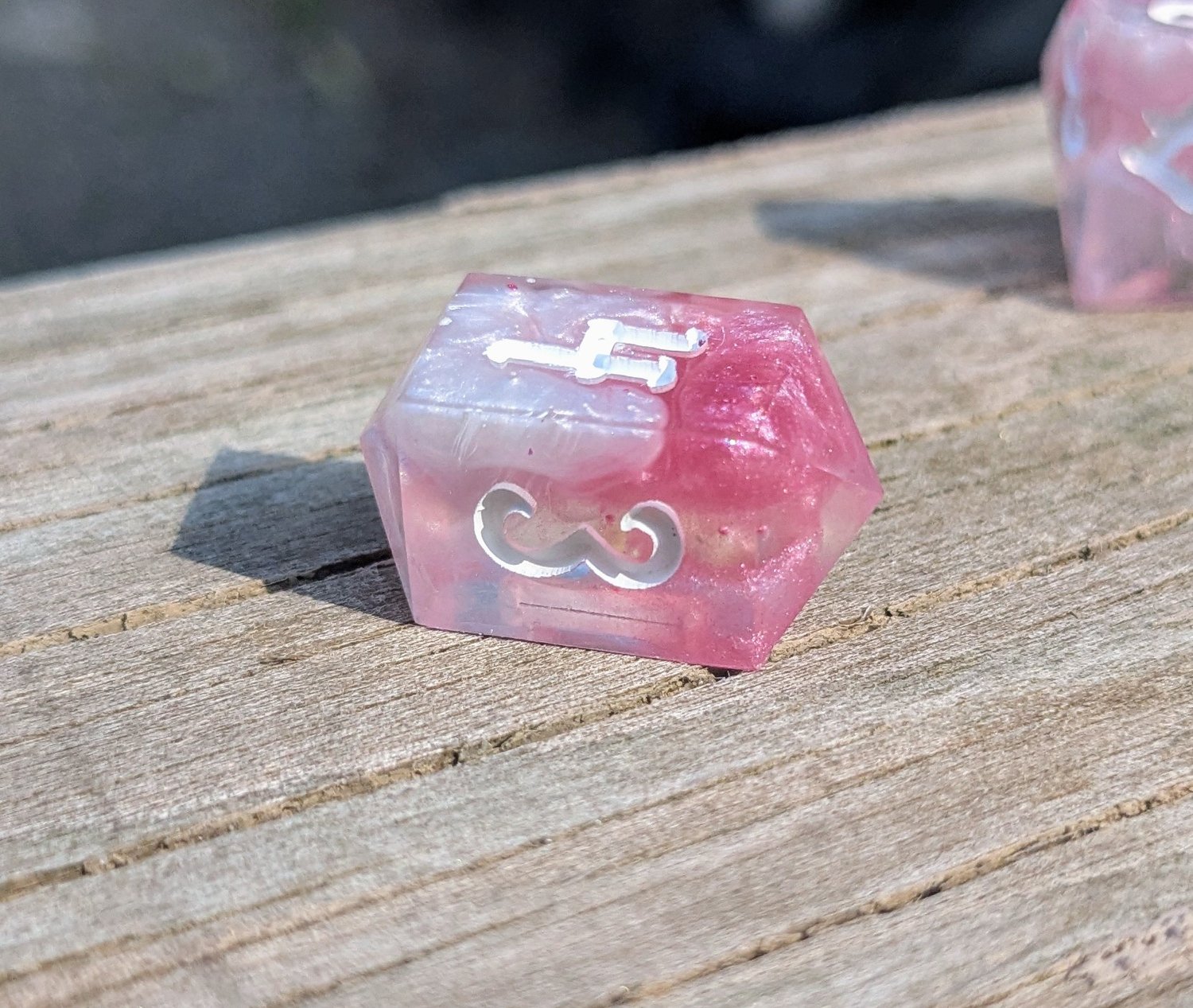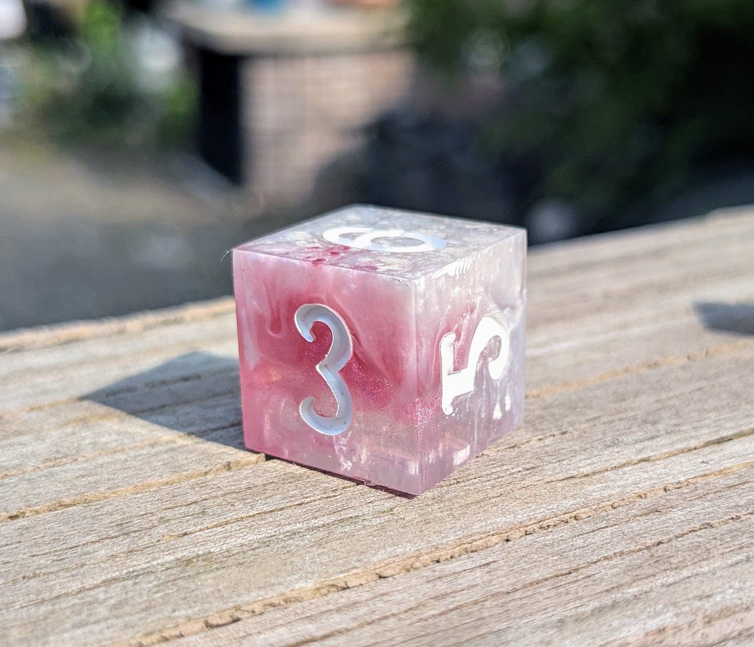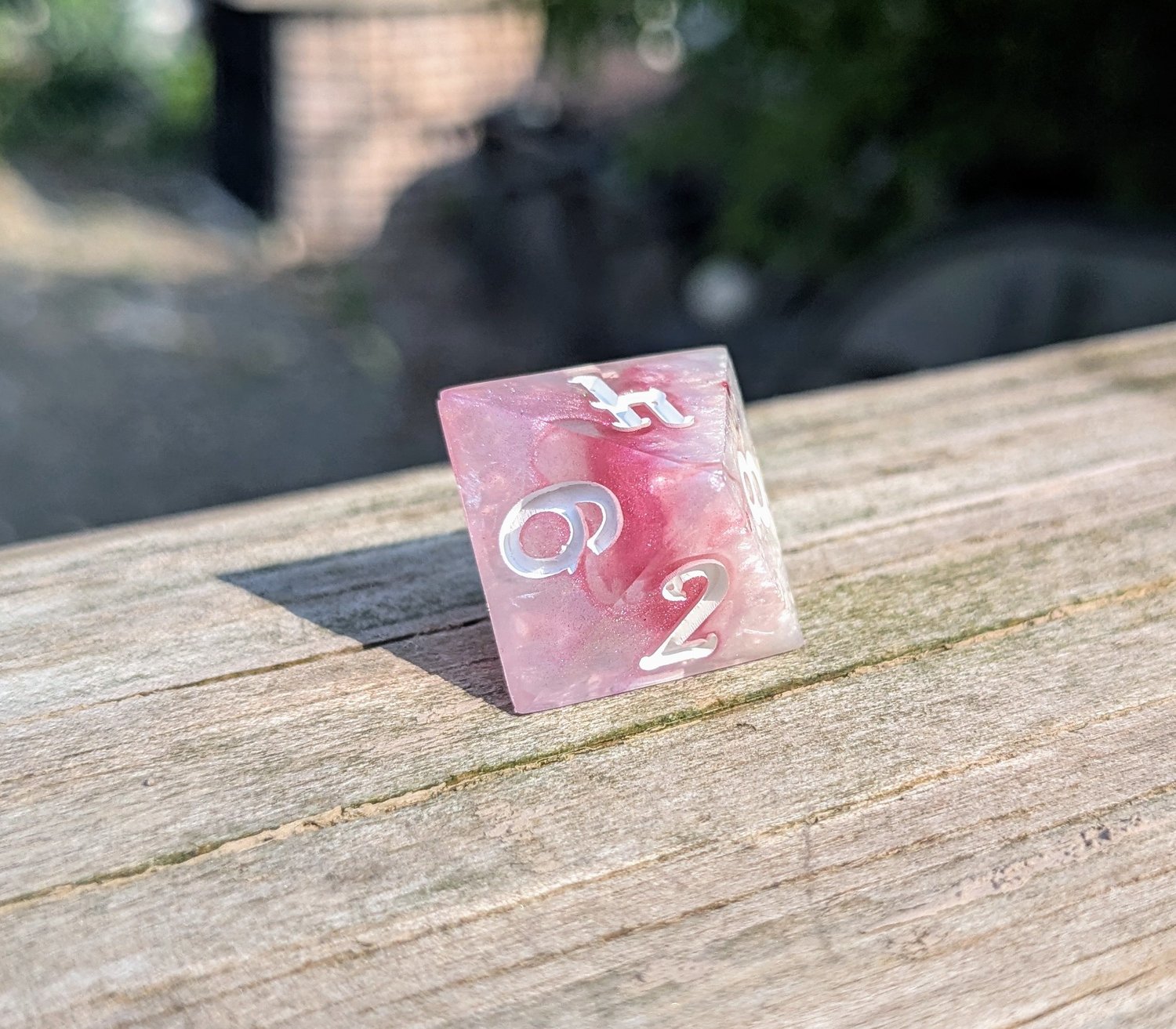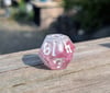 Delicate, daring, and undeniably divine—these dice shimmer like the petals of a magical rose under moonlight. Swirls of soft pink and pearlescent white twist together like enchanted clouds, with crisp white ink for maximum readability. They’re as charming as they are deadly.