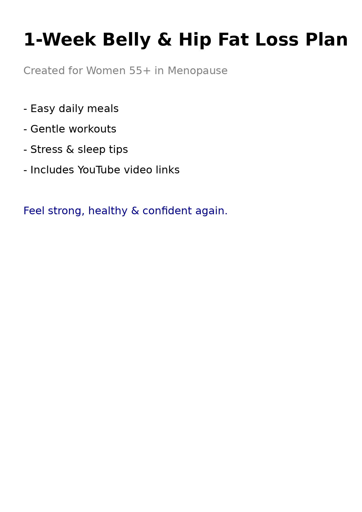 A simple 1-week belly and hip fat loss plan created for women 55+ going through menopause. Includes easy meal ideas, gentle workouts, stress tips, and links to beginner-friendly videos. Feel strong, healthy, and confident again—starting today!