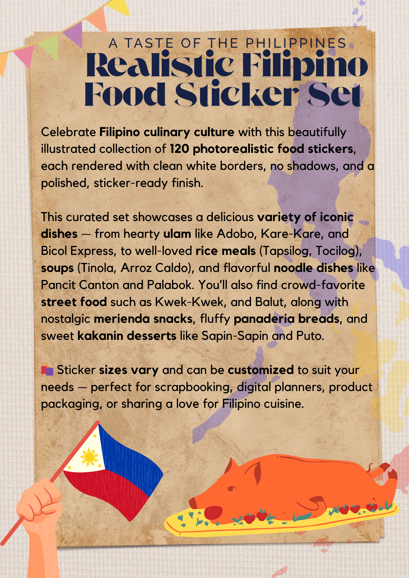 Celebrate the richness of Filipino culinary culture with this beautifully illustrated collection of 120 photorealistic food stickers, each designed with clean white borders, no shadows, and a crisp, sticker-ready finish.