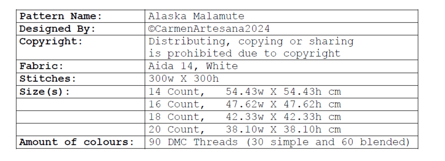 Amount of colours ALASKA MALAMUTE: 90 DMC Threads (30 simple and 60 blended)