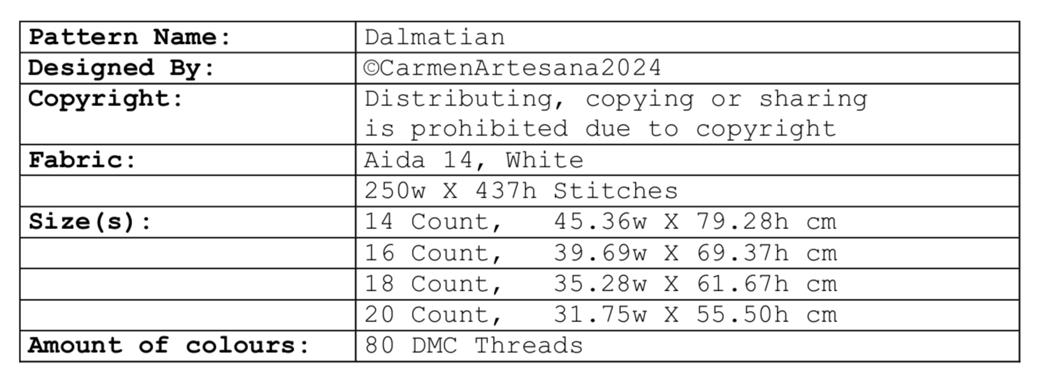 - DALMATIAN, Pattern in black and white symbols with floss legend, in English