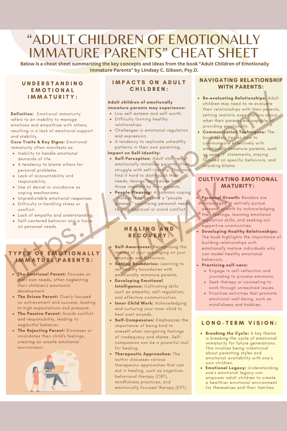 This cheat sheet provides an overview of Lindsay C. Gibson's book, "Adult Children of Emotionally Immature Parents". The book provides valuable insights into the long-lasting effects of emotional immaturity on parenting and relationships. By understanding these dynamics, individuals can work towards healing, establish healthier boundaries, and foster emotional maturity in themselves and their own families.