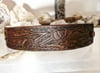Hand tooled leather cuff, brass snap bracelet with oak leaves and acorns. Stained medium brown.