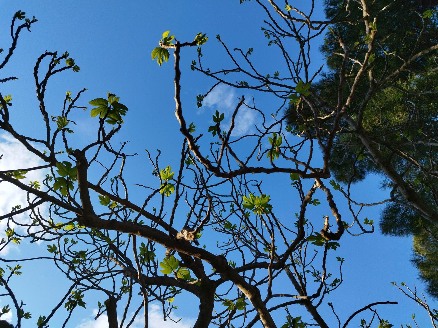 Bare branches with a scattering of green leaves reach up into a vibrant blue sky. A contrast is formed between the delicate new growth on the tree limbs and the vast expanse of the clear sky above.