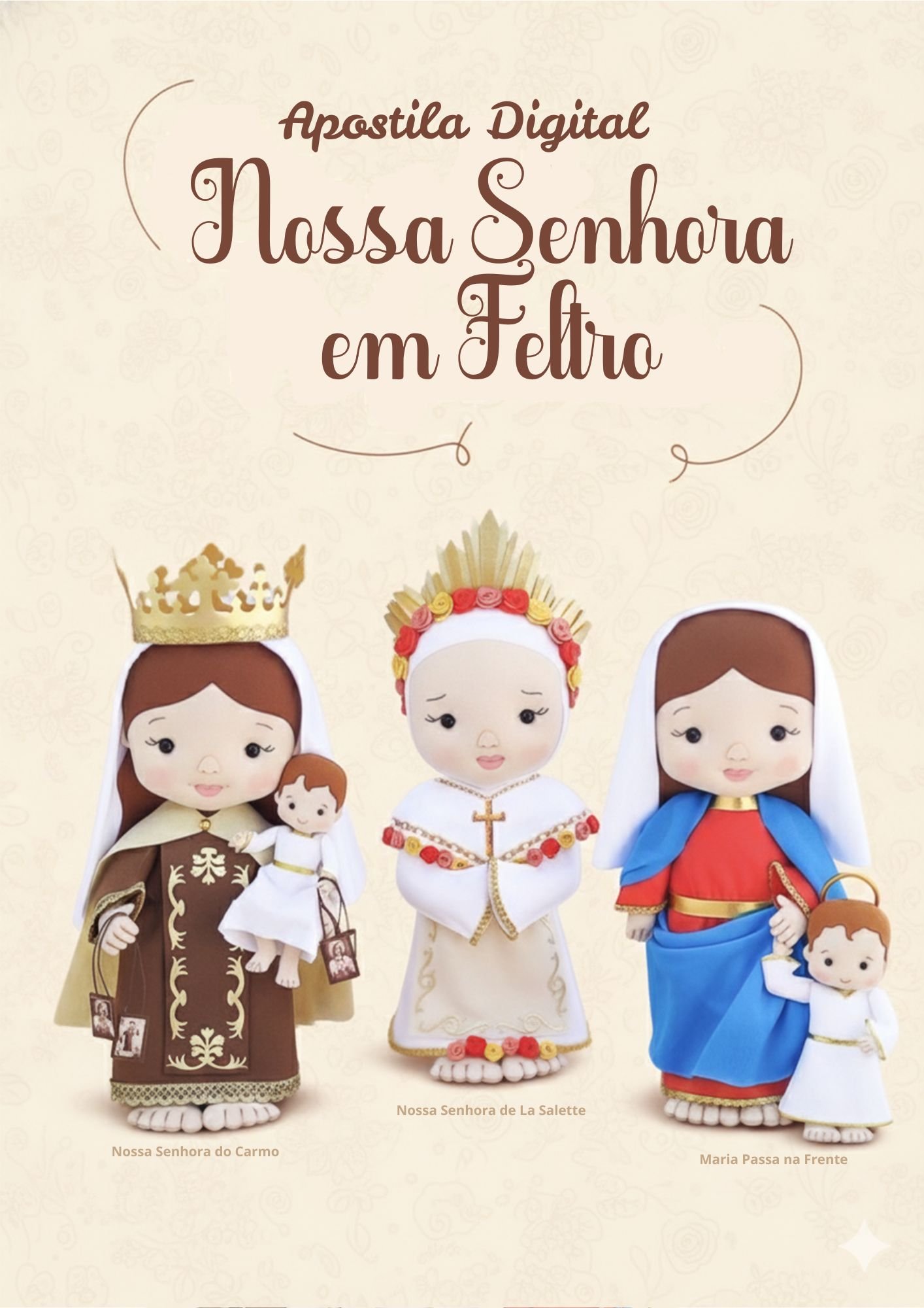 Com a Apostila Digital Nossas Senhoras em Feltro 2, você aprenderá a confeccionar 3 títulos de Nossas Senhoras: