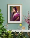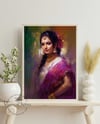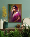 An exquisite Indian woman portrayed in an elegant pose, gracefully adorned in a vibrant purple saree. This captivating painting exudes warmth with its dominant purple hues, while cool undertones add depth and balance to the composition. Immerse yourself in the realm of romantic impressionism as each brushstroke captures the essence of this enchanting scene. The masterful impasto technique lends a rich texture, enhancing the overall visual appeal. Embrace the beauty and cultural richness of India through this breathtaking artwork, sure to evoke a sense of awe and admiration.