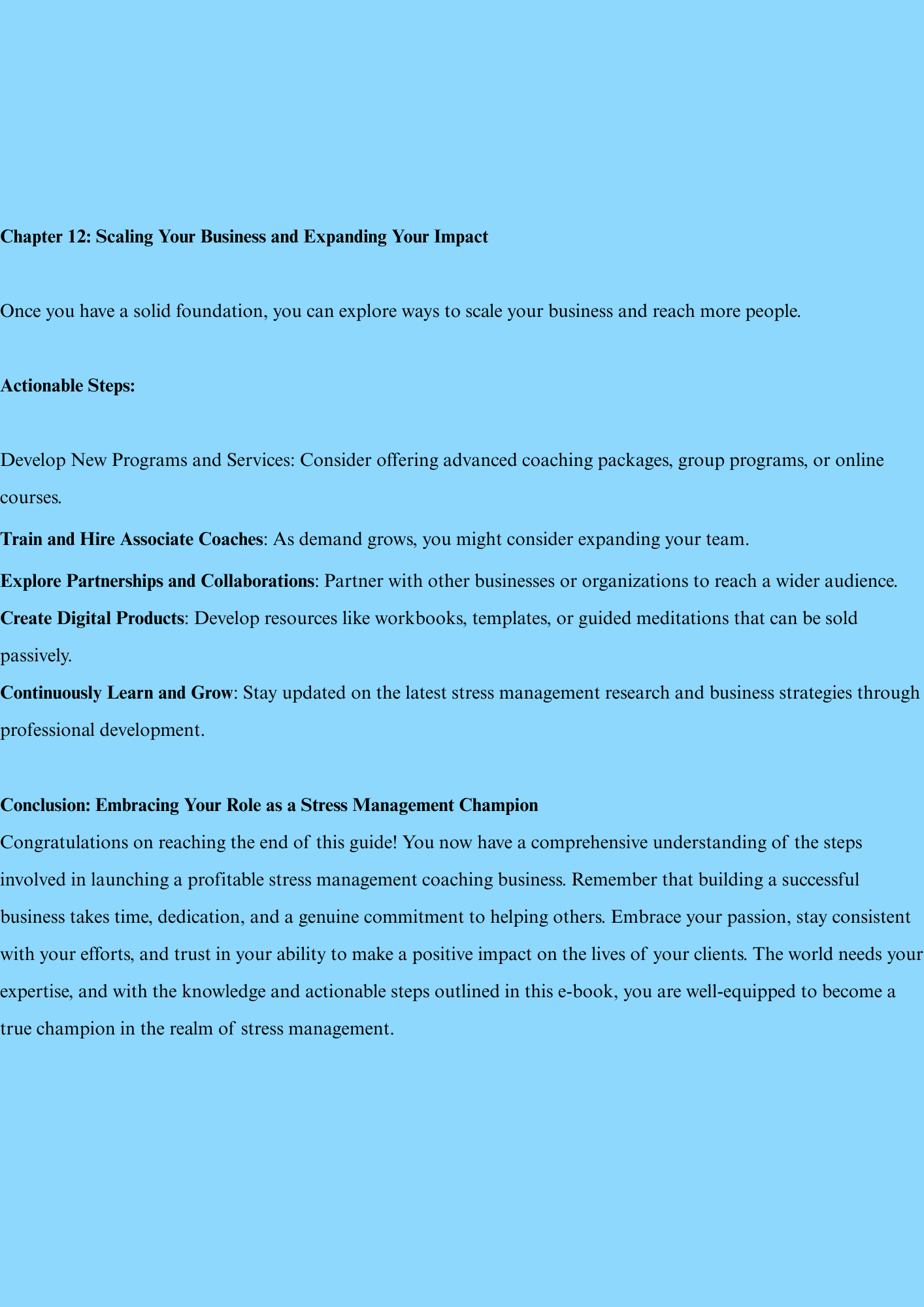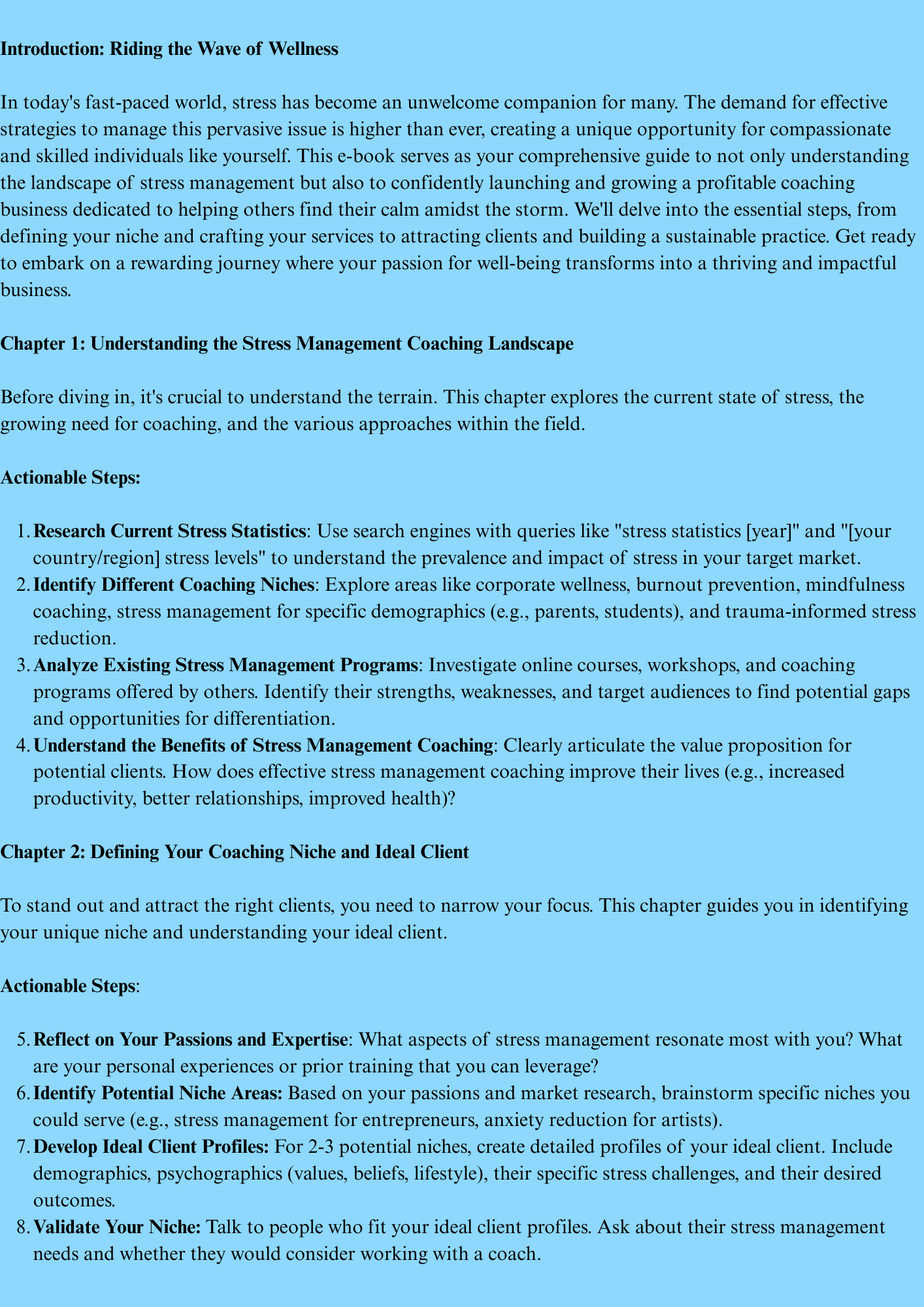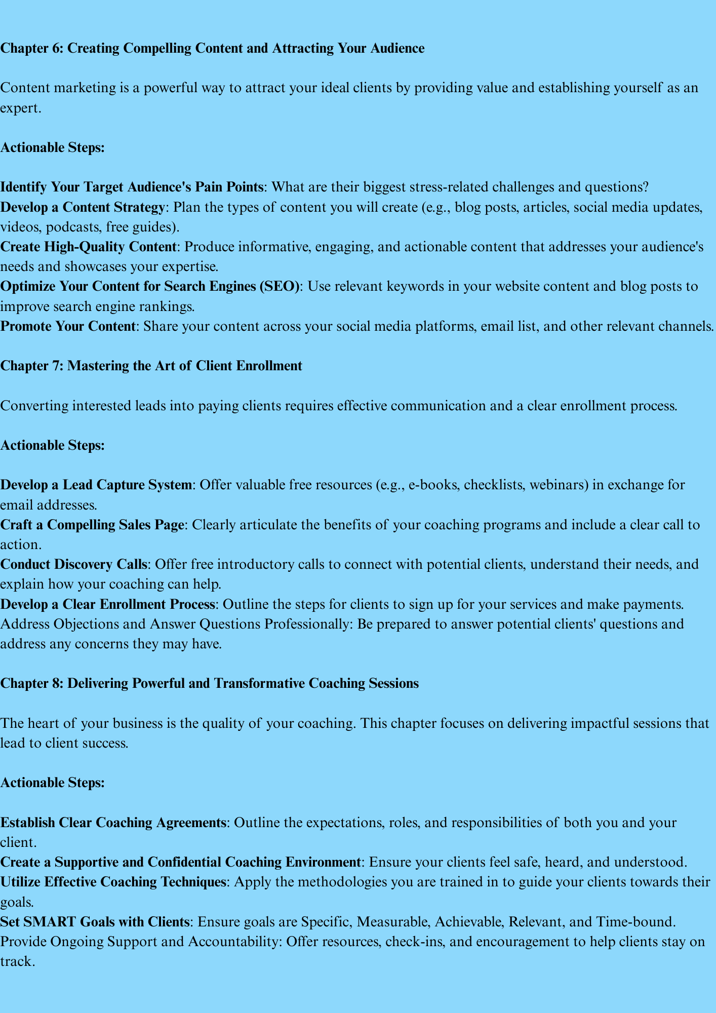 This isn't just another business guide. It's a compassionate and practical blueprint designed specifically for launching and scaling a stress management coaching practice that aligns with your values and prioritizes well-being—both yours and your clients'.