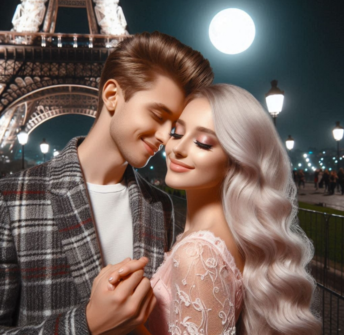The second couple to appear today is Alexander and Elizabeth. The boy has neat brown hair and a checkered coat and a white shirt. The girl has beautiful silver light brown long curly hair and wears a white striped silk trousers. The two of them hold hands tightly and the boy kisses affectionately! Behind them is the bright iron tower that night, a bright white moon hanging high in the sky, and the tranquil street lights adding a lot of romantic color!