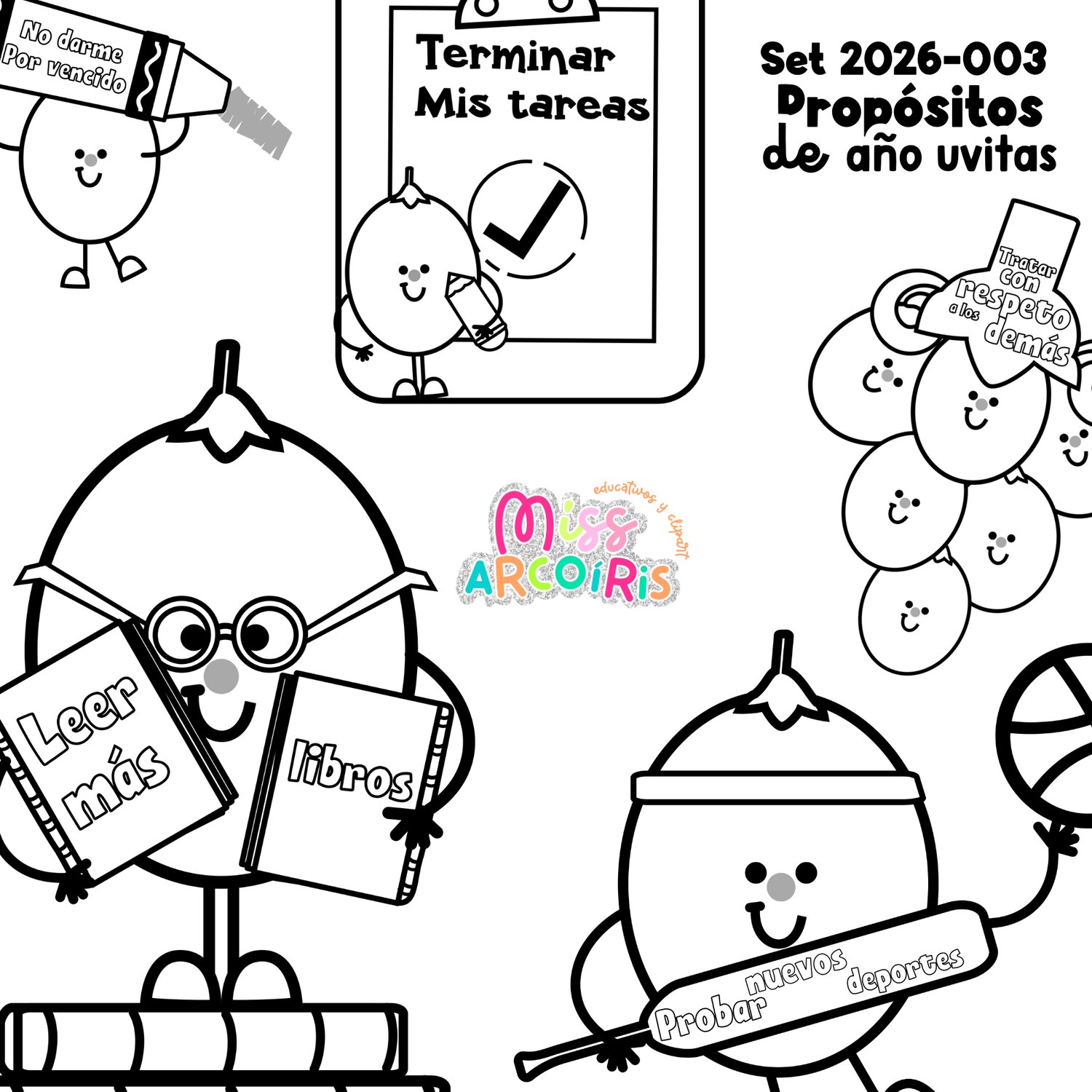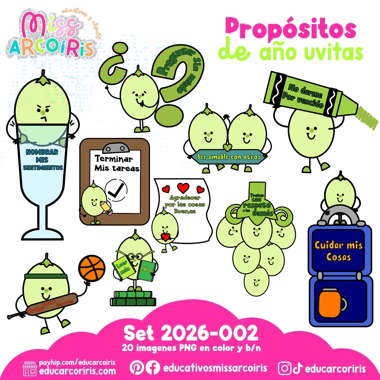 Inspirado en la tradición de las 12 uvas, este paquete está diseñado para motivar a los alumnos a trazar sus metas de una manera visual y divertida.