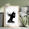 Elevate your space with this stylish wall art, perfect for housewarming gifts or adding sophistication to any room décor. This captivating artwork captures the essence of ethereal beauty in a beautiful African woman. Rendered in a mesmerizing hyper-minimalist style, the portrait draws inspiration from the enchanting aesthetics of Nicoletta Ceccoli and Anne Bachelier. It's a blend of vintage allure and contemporary elegance that's sure to impress.
