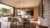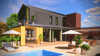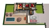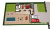 This modern house plan is an architectural masterpiece designed using four 40-foot shipping containers and two 20-footers. The containers are stacked two-on-two to create a modern container floor plan with 3 bedrooms, 3 bathrooms, and an open-plan living area. Additionally, the house boasts a swimming pool in the backyard, surrounded by a spacious pool deck area and outdoor living space perfect for entertaining.