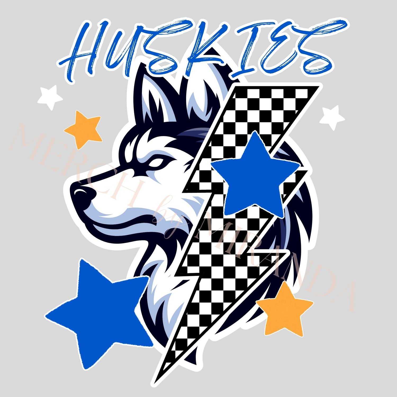 Huskies Mascot Blue | Sublimation Design | Digital Download | School Spirit Shirt PNG | DTF Design | Lightning Bolt-Checkered with Stars - Huskies