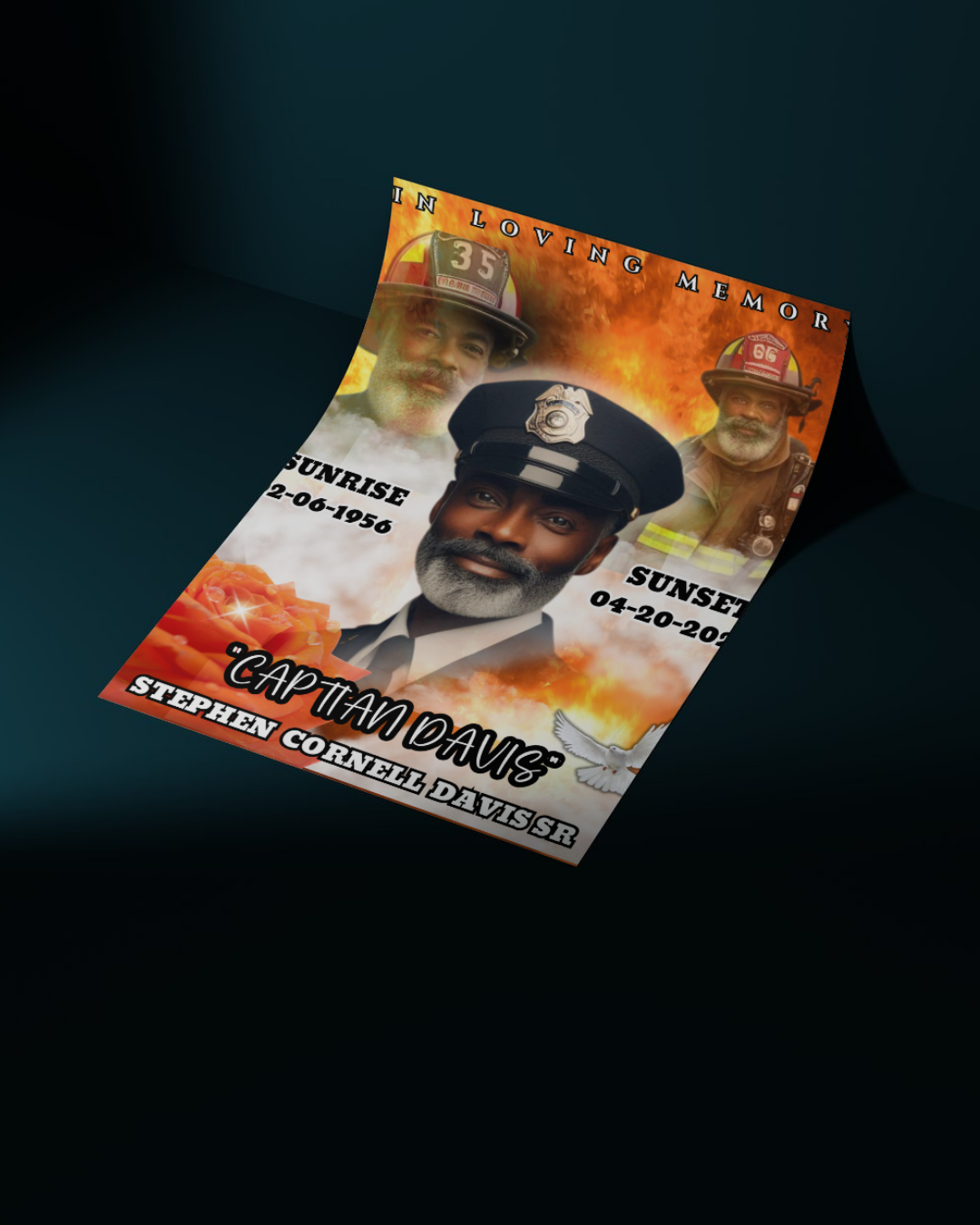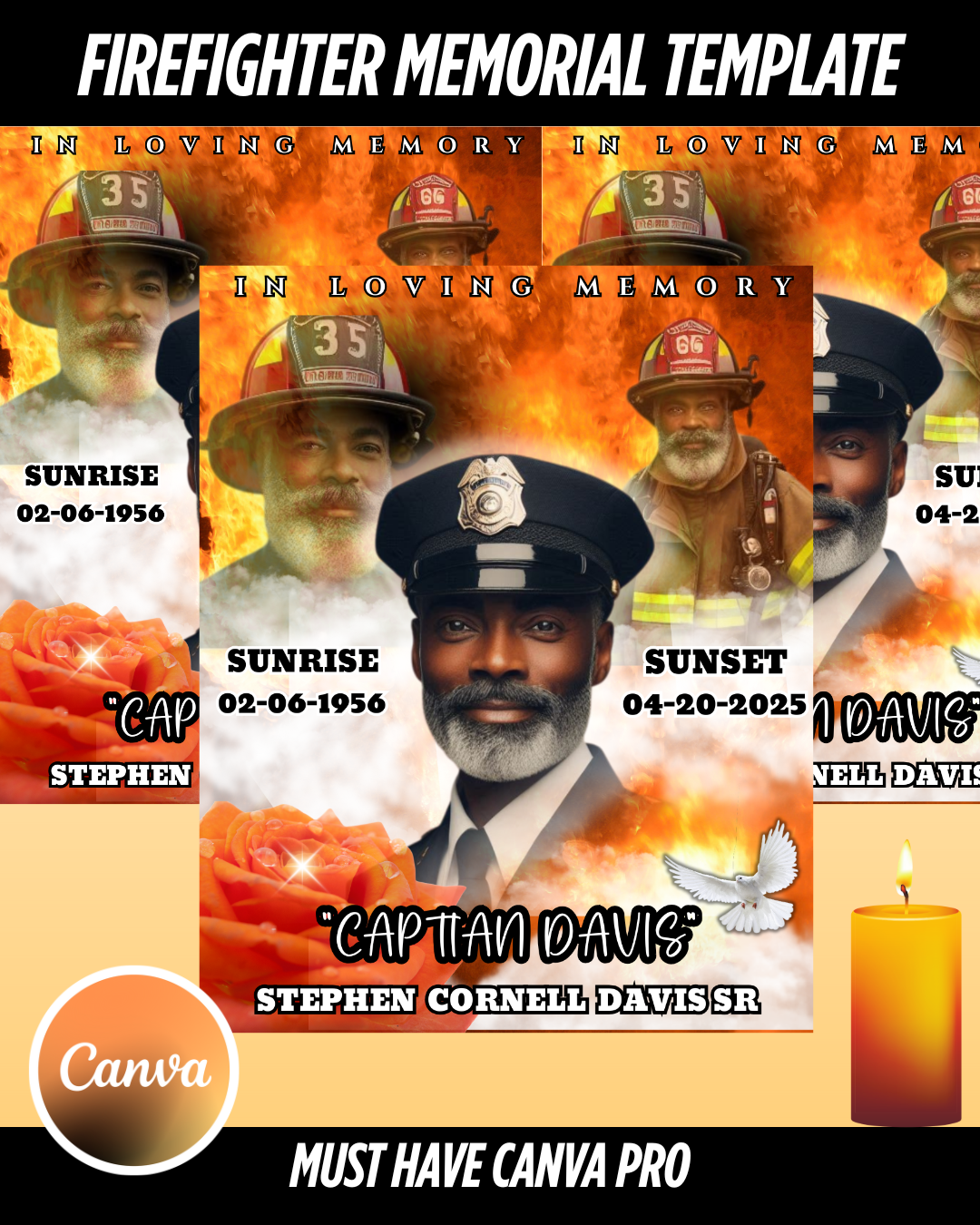 Create a meaningful and dignified memorial design with this editable firefighter tribute template, perfect for digital memorial posts, printed signage, or keepsake displays. Designed for use with Canva Pro, this template allows you to personalize every detail from photos and names to quotes, and service dates.