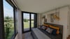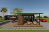 This modern house plan is an architectural masterpiece designed using four 40-foot shipping containers. The containers are elevated off the ground on a pier foundation in an L-shaped layout to create a modern container floor plan with 3 bedrooms, 2.5 bathrooms, and an open-plan living. The living room opens onto a large outdoor deck with alfresco dining overlooking the pool. Additionally, the house boasts a 40-foot container pool at the rear, surrounded by a spacious pool deck area, perfect for entertaining.